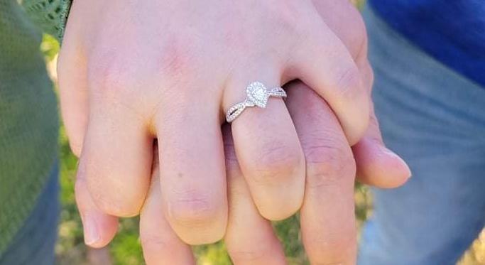 We were sitting on the couch, just got done showing him everything I had found at Affair of the Heart. Josh says hey you wanna get family photos done? We haven’t taken pictures together in a few years. He said we can have your dad take them down the street in that wooded area. Fast forward to “the day “. Sunday morning coffee with the bro and my dad, we learned one of the bristas was going to propose to her boyfriend. So Josh & I are heading to my dads for pictures and I’m telling him all about it and he just says thats cool. We head down to the wooded area and start taking pictures with our puppers Ollie! (He wasn’t having it) I start pointing at trees and saying maybe we should take some over there. I turn around to find Josh on one knee!! I was so shocked I looked frozen and barely got yes out in a high pitched voice! Lol