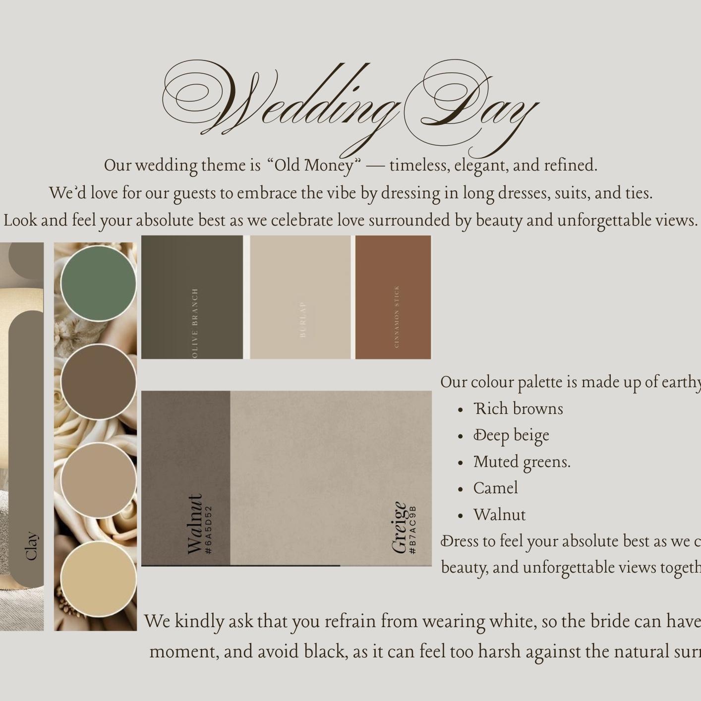 Here you'll find all the details you need to help you pack and plan for our wedding day- including dress codes, colour palettes, and style inspiration for our wedding. We can't wait to celebrate with you!