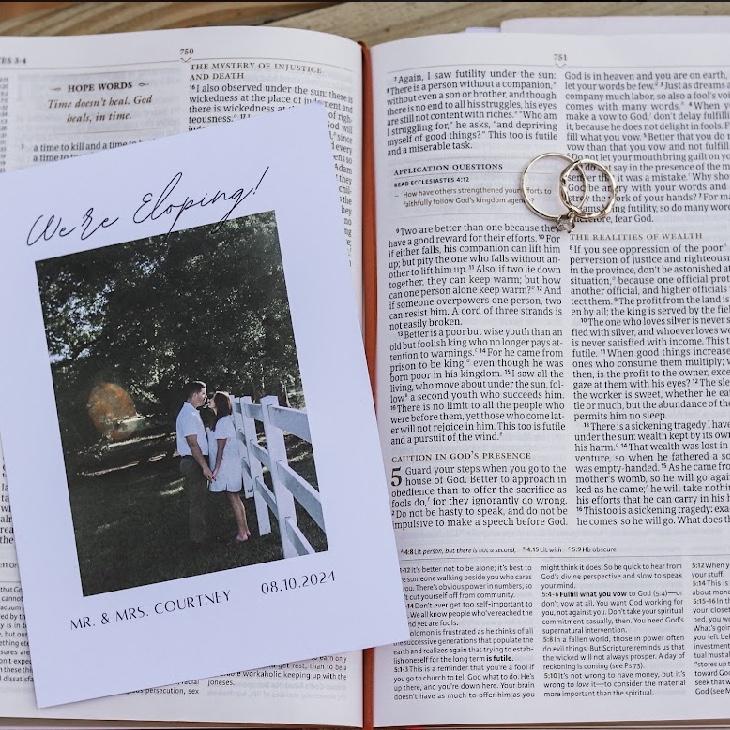 Zach and I are excited to share that we will be eloping on August 10th of 2024 at our favorite, Percy Quinn State Park! We will be joined for a small ceremony with our parents and siblings for a beautiful and intimate union at the old outdoor church. The big celebration, however, will be on September 8th with all of our family and friends! We hope to see you there! Dearest, The future Mr. and Mrs. Courtney