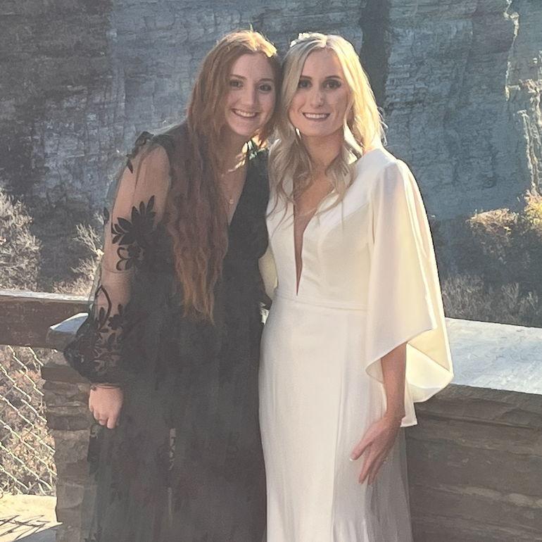 Lauren is Kaitlyn's sister and built-in best friend, who she always looked up to and wanted to be growing up. With childhood memories of Lauren cleaning up after Kaitlyn when they shared a room, to Nicholas taking over, Lauren has always been Kaitlyn's biggest support system. As they grew up, the two would jam out in the car as Lauren picked her up from school clubs, sports, and friends' houses. Fast forward to today. Kaitlyn now often spends the night at Lauren and her husband's house, dog sits for Lauren, and joins Lauren thrift shopping and trying new foods and teas. Lauren is always suckered into things with Kaitlyn, like going to multiple up-and-coming artist concerts or seeing a new movie that Kaitlyn bought tickets to, while also telling Kaitlyn what to write back in text messages. Lauren has always been the calm for Kaitlyn and the heart of their family, with the two always sticking by each other's sides in each other's friend groups, cheerleading, and life, no matter what. Kaitlyn cannot imagine her life without Lauren as she has been by her side through so much, and it is only fitting that she is right next to Kaitlyn on her wedding day!