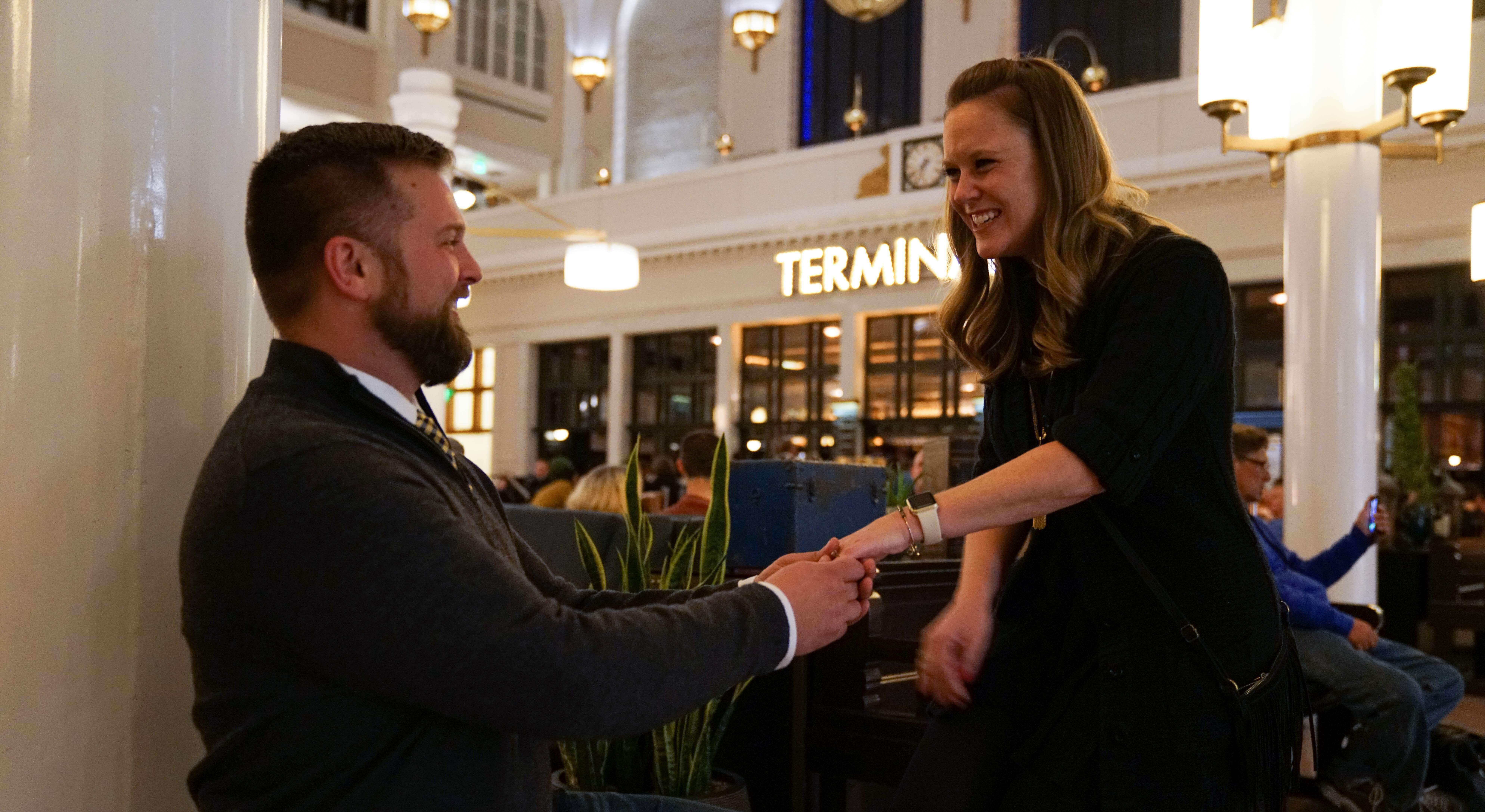After years of living their lives individually, Brandon and Kara knew that this relationship was special from the get go. They were inseparable from the time they met and things just 'clicked'. They were gearing up to celebrate their one year anniversary and Brandon let Kara know that he had booked ski train tickets for them to head up to Winter Park for a day of skiing. What Kara learned later was that he had also established a plan to stay at Union Station the night before catching the train. Brandon knew that this was one of Kara's favorite architectural spaces. Kara was very excited and booked a reservation for drinks at one of their favorite spots, Coopers Lounge, in Union Station. It was on their way across the great hall that Kara felt a shrug and turned around to have Brandon on one knee asking to her to marry him. She quickly said yes and here we are... #Rowlandinto2018!