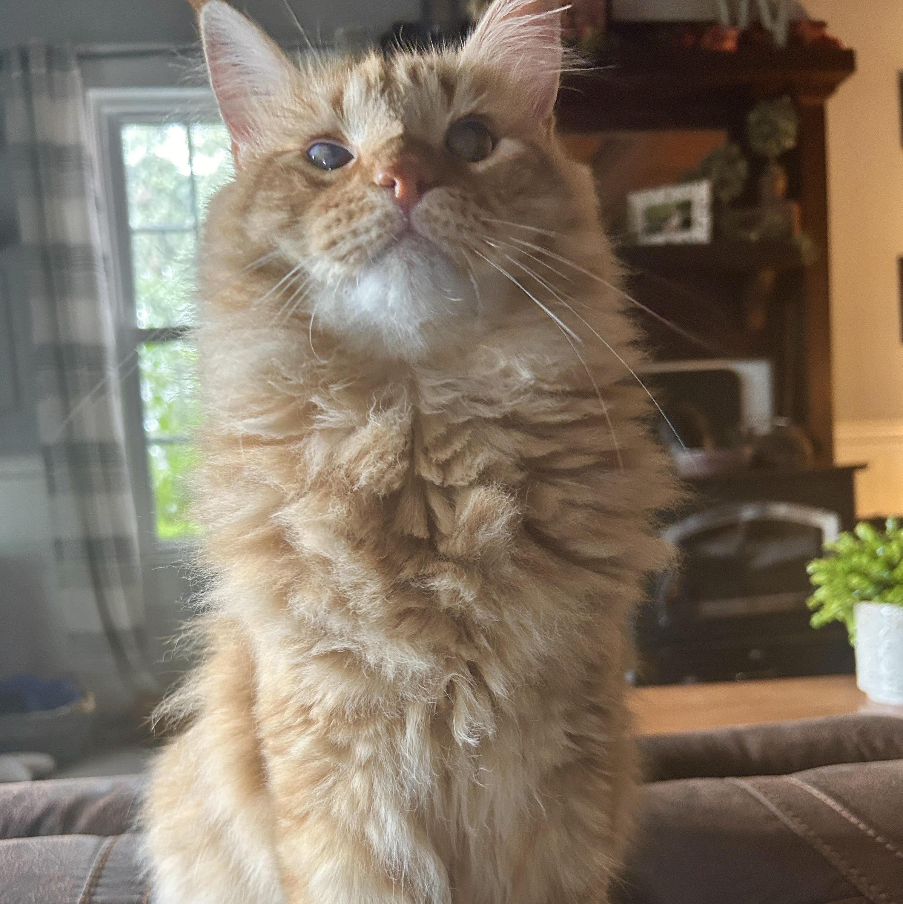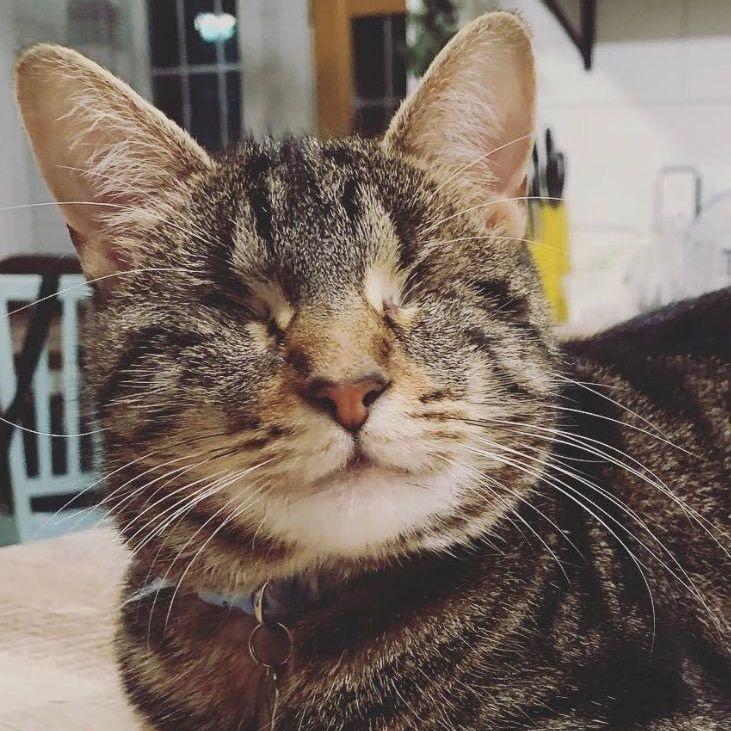 Jack is our newest resident and came to us March 23, 2023. We brought him in to foster after he had survived a URI, acute double eye infections and Feline Pan-leukemia, which is extremely rare. He spent almost 21 days total in the ICU at the vet and due to his high fevers suffered some neurological damage. Miraculously, he survived all of this. He is 100% blind in one eye and has limited vision in his other eye. He walks with a wobble and has head tremors but that has never stopped this goofy boy from loving life. He provides endless laughter with his silly antics and we just knew that we could meet his needs here and wanted to make him a Wilkie almost immediately. He has been such a fun addition to our family and helped us through the loss of Hagrid and Michelle.