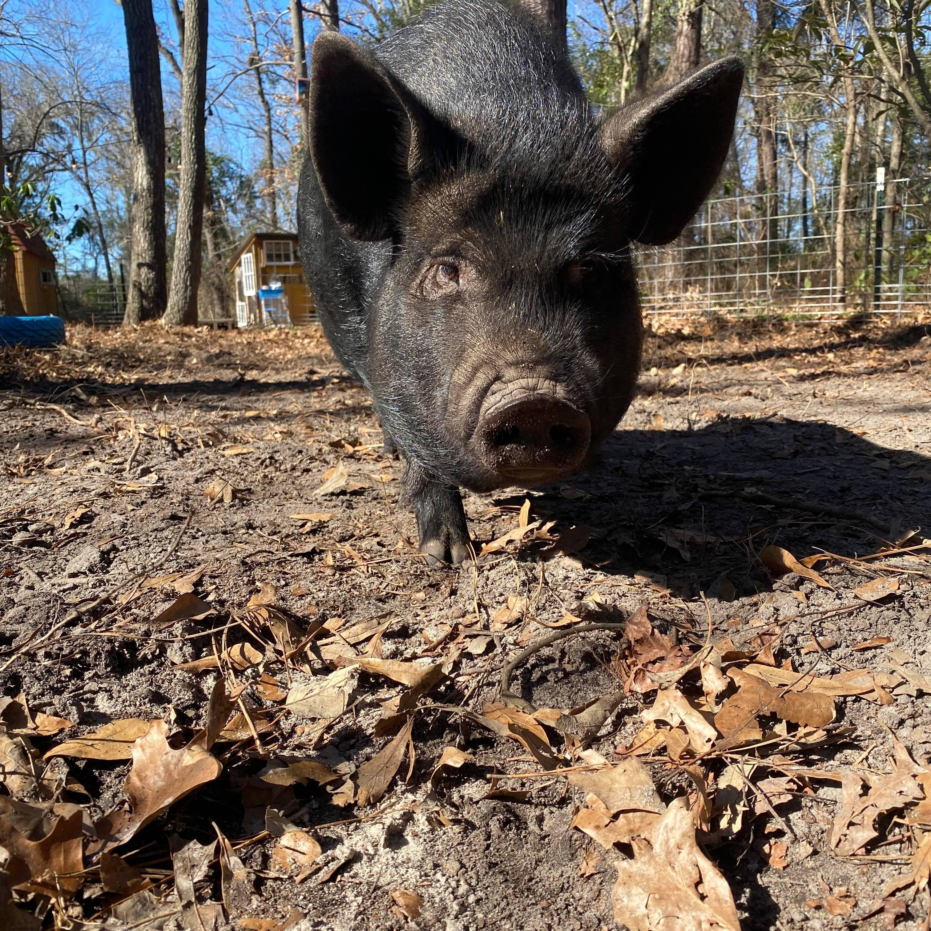 Theodore Richmond Lasso is affectionately known as Teddy. He’s a Pot Belly / Kune Kune mix. Teddy is the result of a pregnant rescue mama. His mom was picked up by animal control, and he, coincidently, was born the day after Mei Mei. Pigs are extremely intelligent and social animals, so we didn’t waste any time adopting him when he was weaned. We knew Mei Mei needed him. Teddy is our Drama Queen Special Boy. He is very vocal and will tell you off in a hot minute if you don’t show up to visit him with snacks. He is always yelling about something - we call them Teddy Tantrums. This boy LIVES for snacks and doesn’t have favorites. All food is his favorite. He will drop for belly rubs in a heartbeat and will also try to climb in your lap if you’ve earned his trust. He is a little wary of strangers, but warms up quickly. The little dangles under his chin are called “waddles.” There is no scientific reason to have them, and they are a breed trait of certain lines.