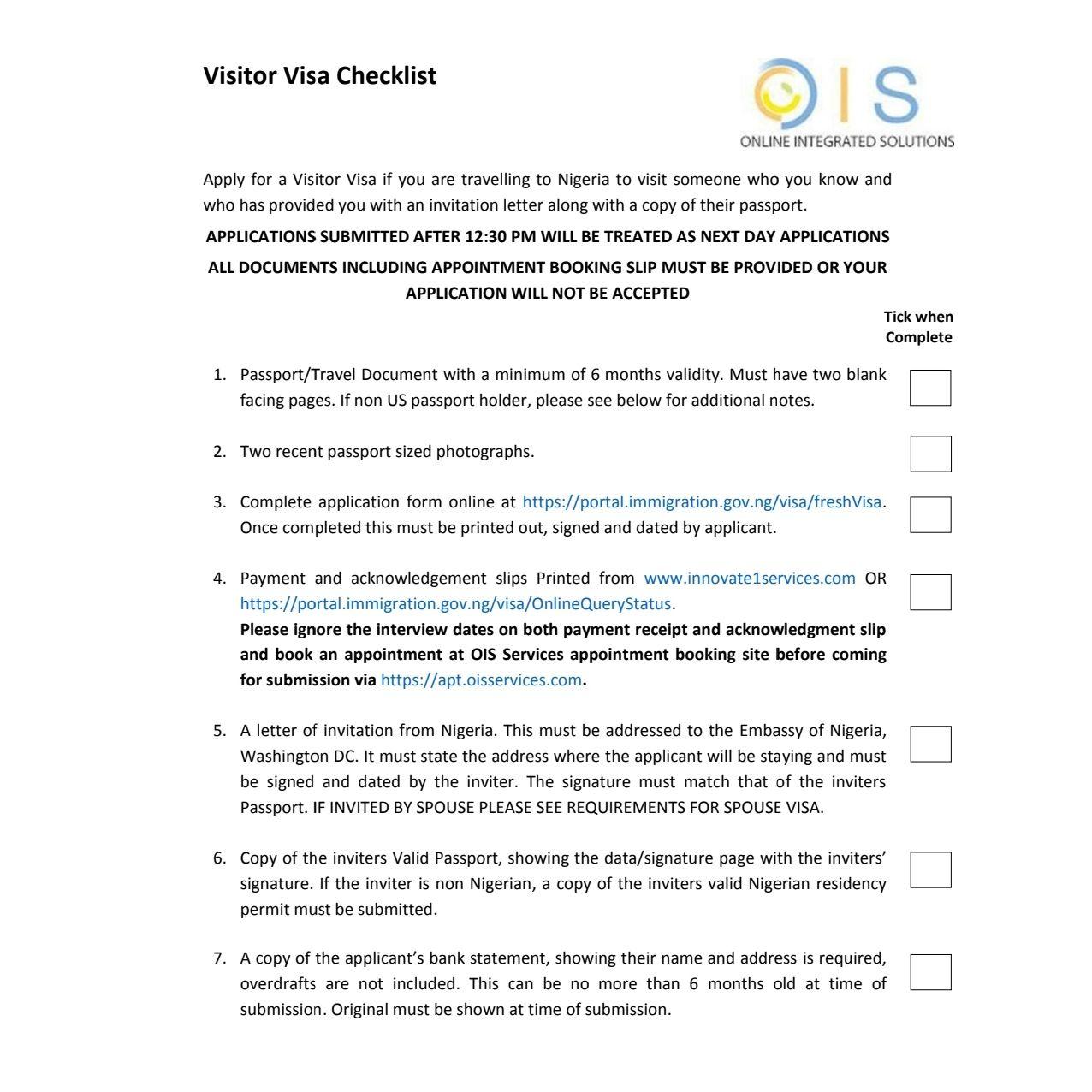 All the requirements are the same but VERY IMPORTANT please put the address of the city you are applying in. You must apply for your visa online I used innovate 1 services then once finished OIS services....this is very important trust me I put the wrong address and it was a problem and had to do that step all over again. Contact me for your invitation letters ASAP please also important. Nigeria ask a lot to come visit so I really appreciate all that's taking time out of their lives to come celebrate my union with me. Plus it's going down :)