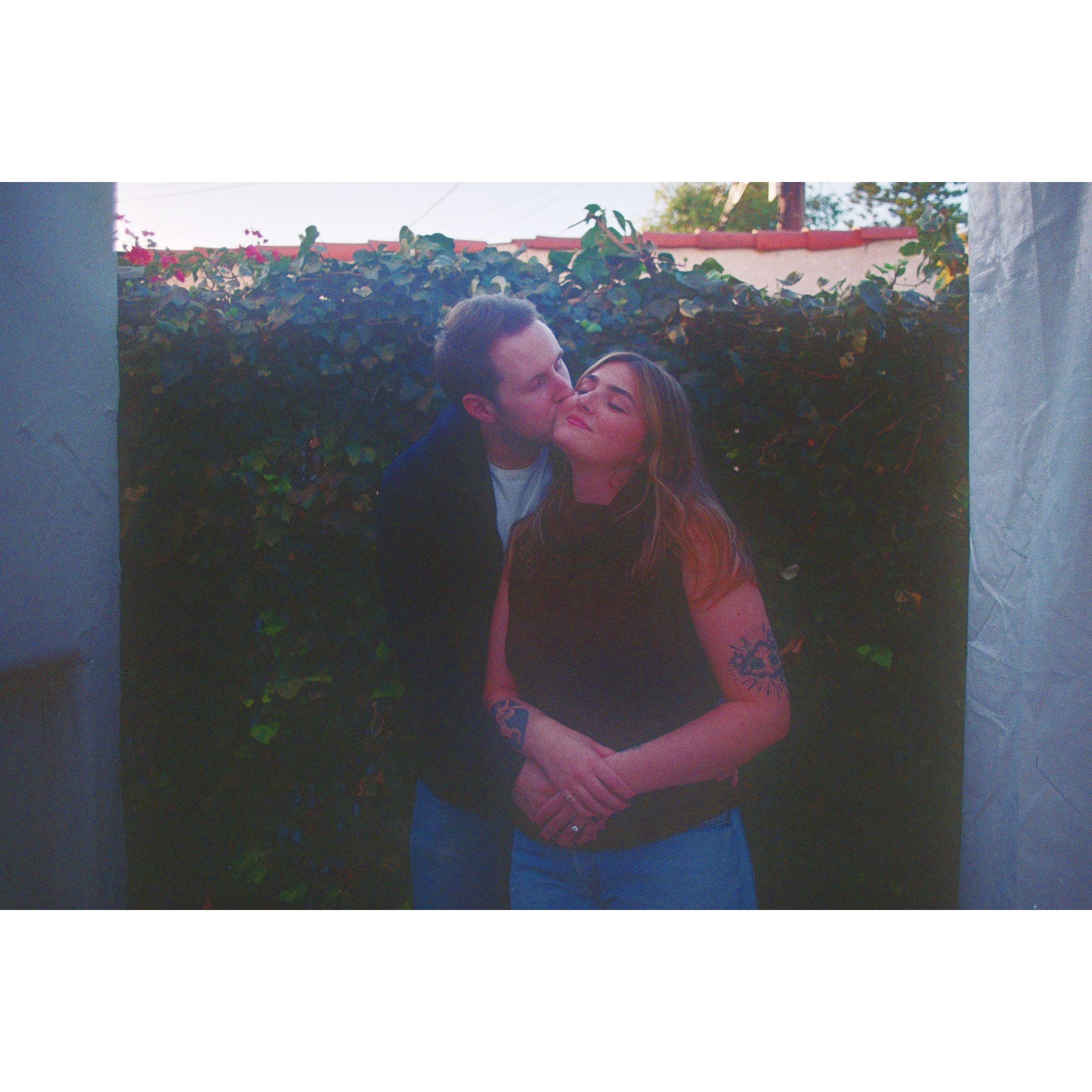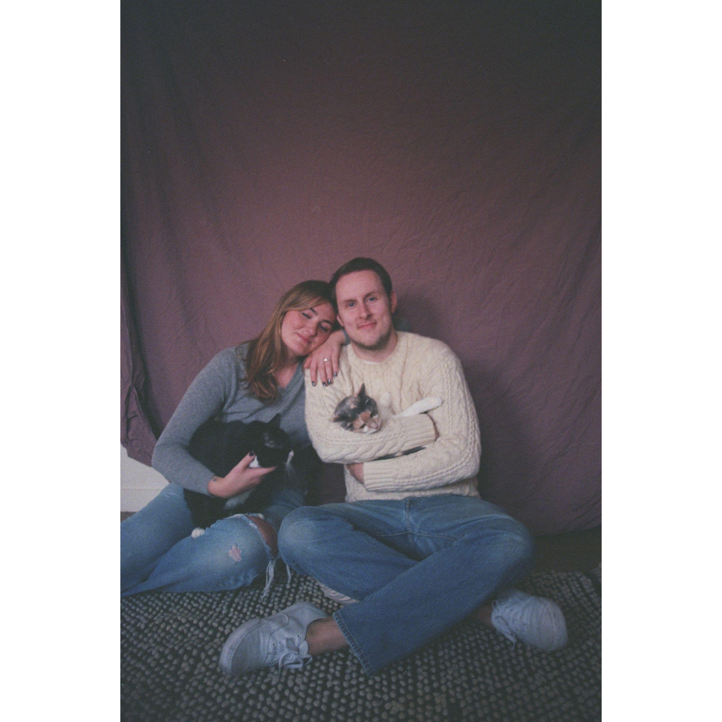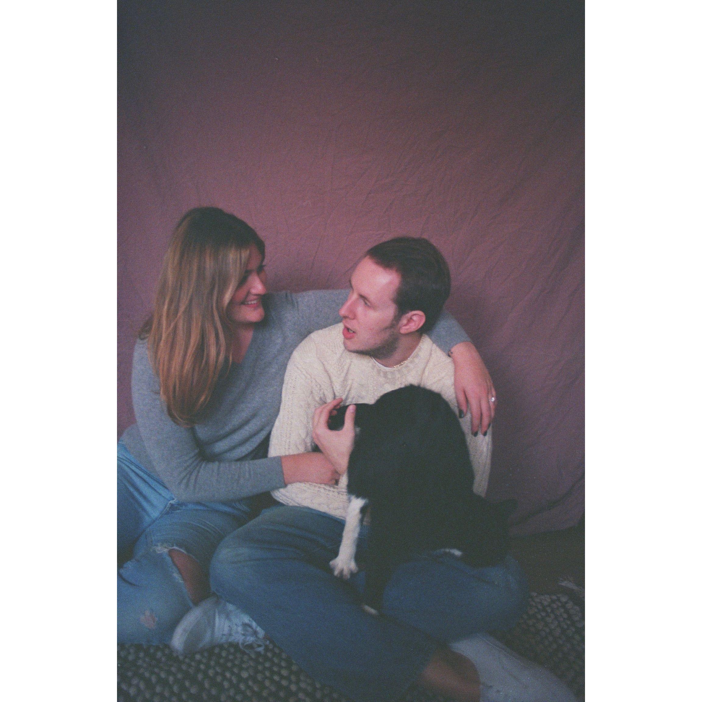 Our engagement shoot at home, we nailed a duvet cover to the wall to use as a backdrop, our friend Amanda took these!