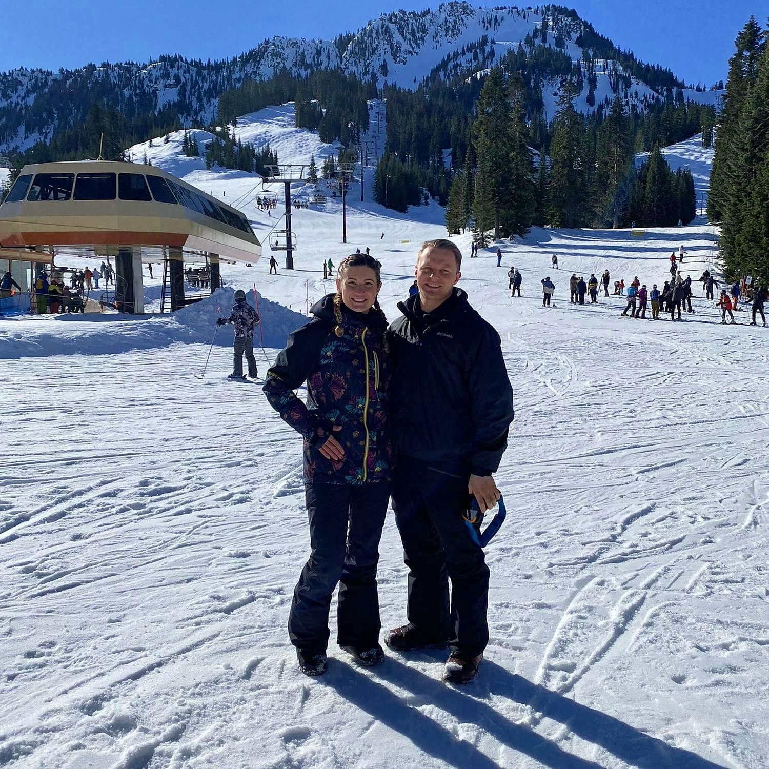 Teaching Kyle to snowboard in Washington