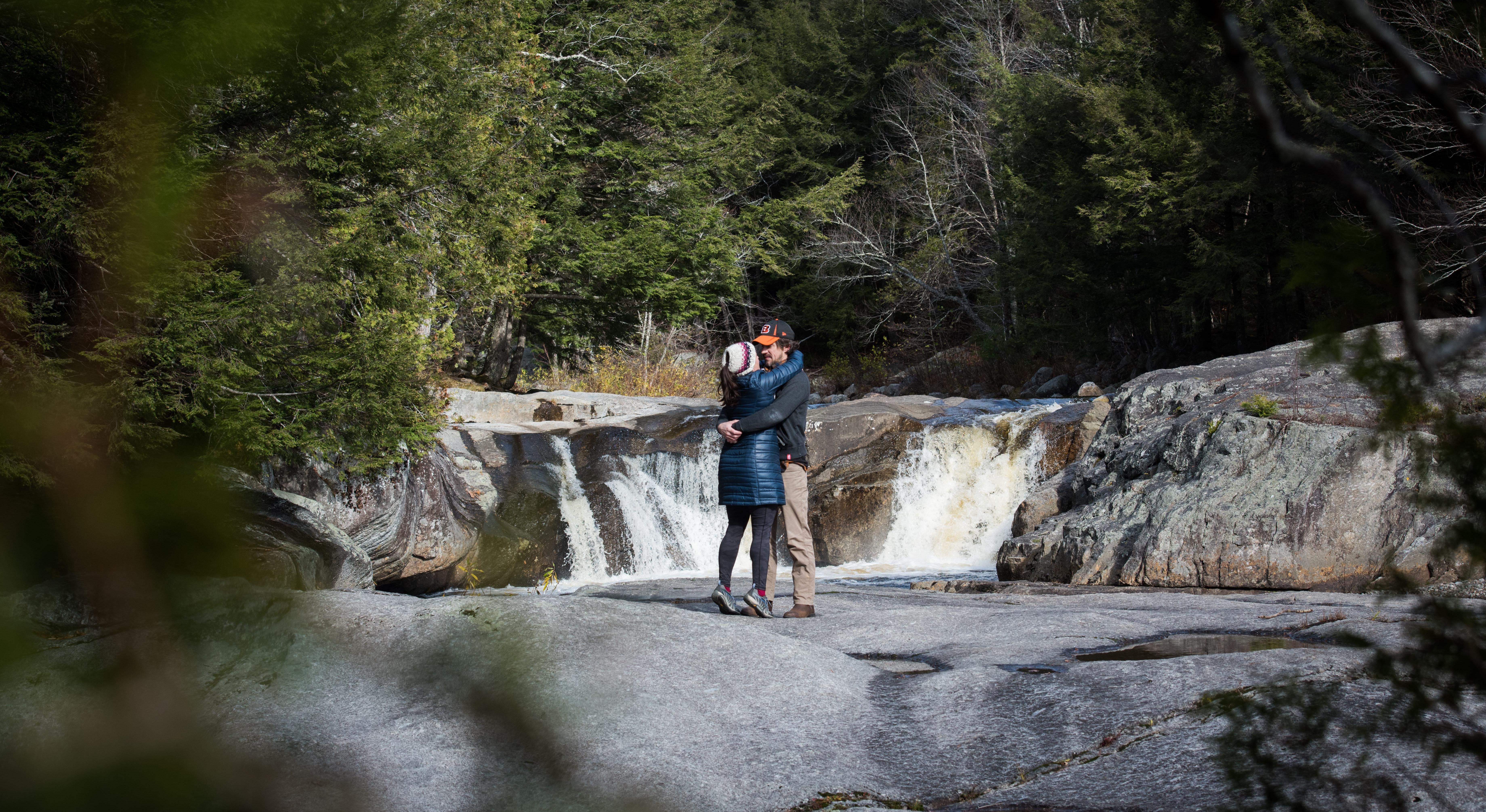 Lauren and Jeremy were visiting Jeremy's brother Brian and sister-in-law Kate in October 2020 at their farm in Maine. They went for a hike on a beautiful fall day to celebrate Kate’s birthday. While Lauren was running ahead with niece and nephew Lula and Finn, Brian asked Jeremy when he was planning to propose. Brian knew Jeremy had a custom engagement ring made by good friend Kim Wallis months earlier. Jeremy told Brian he had the ring with him, nestled in a beautiful wooden box crafted by good friend Joe Berry. Jeremy had been carrying it around waiting for the perfect moment, and Brian pointed out that this was one such moment. There was an incredible waterfall at the end of the trail and Kate, a professional photographer, had brought her camera. When the crew arrived at the waterfall, the kids played, the adults enjoyed the sights and smells of autumn, and Kate snapped pictures until it was time to head back. But Jeremy still had not popped the question! He hung back and called to Lauren for one more hug in front of the waterfall, and Lauren noticed he was shaking. When she asked why, Jeremy said because it’s cold, and paused, and said he also was nervous because had a question. And then he got down on one knee and asked, "will you marry me?" Lauren was in complete shock and kept repeating, "what's happening?!" while she leaned down to kiss Jeremy again and again. Realizing she hadn’t actually said yes yet, and that Jeremy’s knee must be getting sore from the granite. Lauren emphatically said "Of course! Yes!” and pulled Jeremy to his feet. Thankfully Brian noticed something was happening and got Kate’s attention. Kate scrambled through branches and boulders, and thanks to her talent, captured beautiful images of one of the best moments of Lauren's and Jeremy’s lives. Still in shock on their hike back to the car, Lauren, a known crier, didn't actually shed a tear until Finn gave her a big hug and said "Congratulations, Aunt Lauren!"