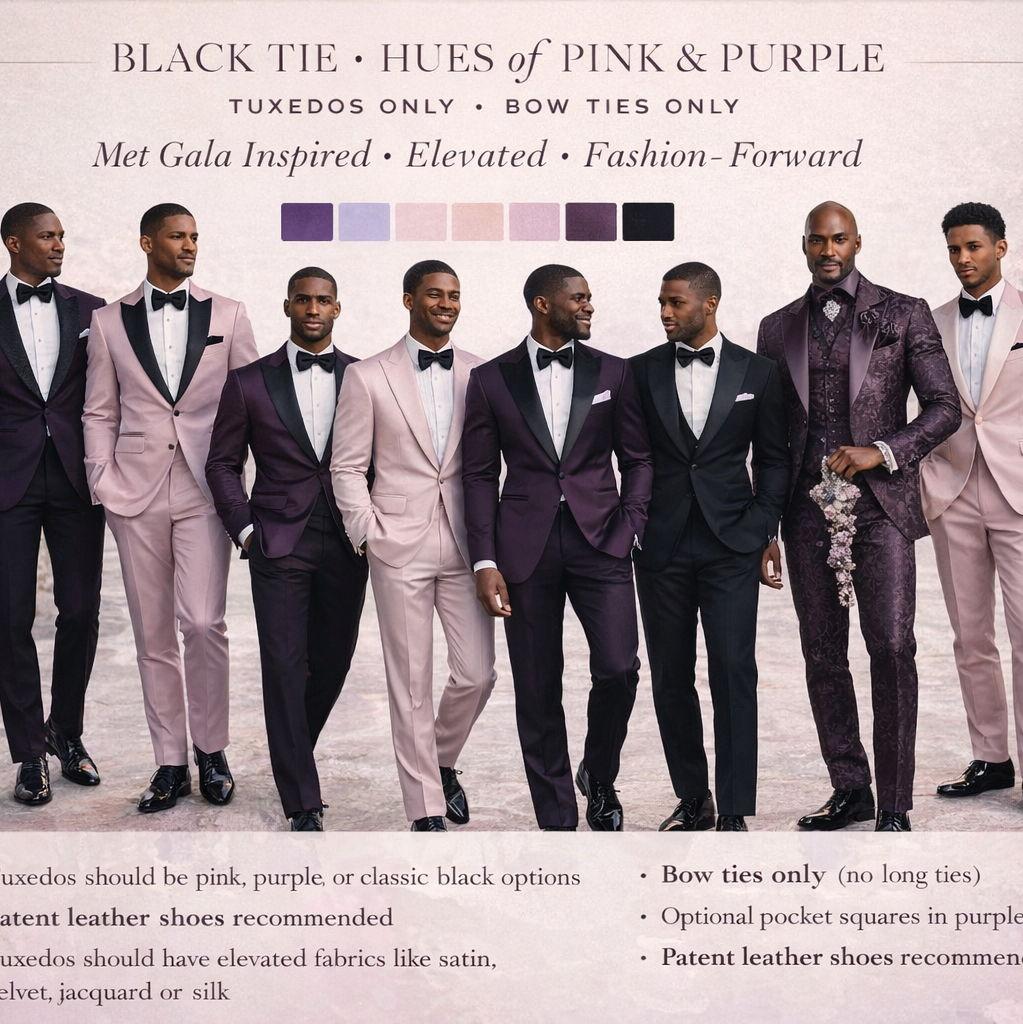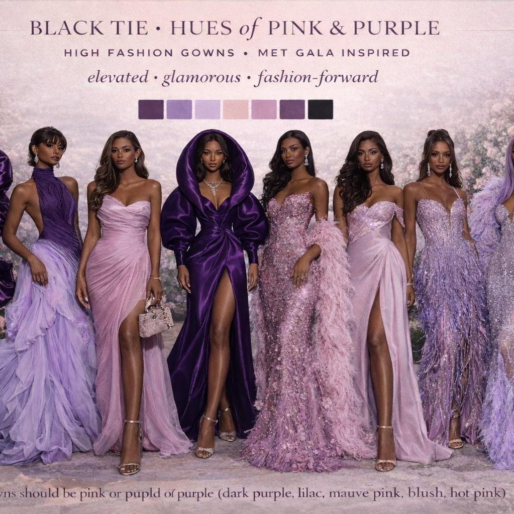 Our wedding will be a Met Gala–inspired black tie celebration, embracing a bold, maximalist glam aesthetic. Guests are encouraged to wear formal black tie attire in hues of pink and purple, from soft pastels to deeper tones such as amethyst and plum. ( Baby pink and Lilac is preferred)
