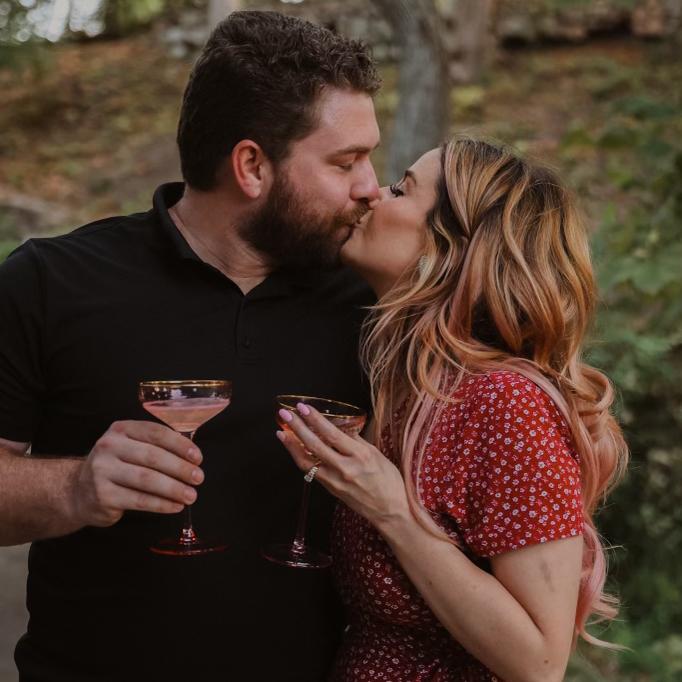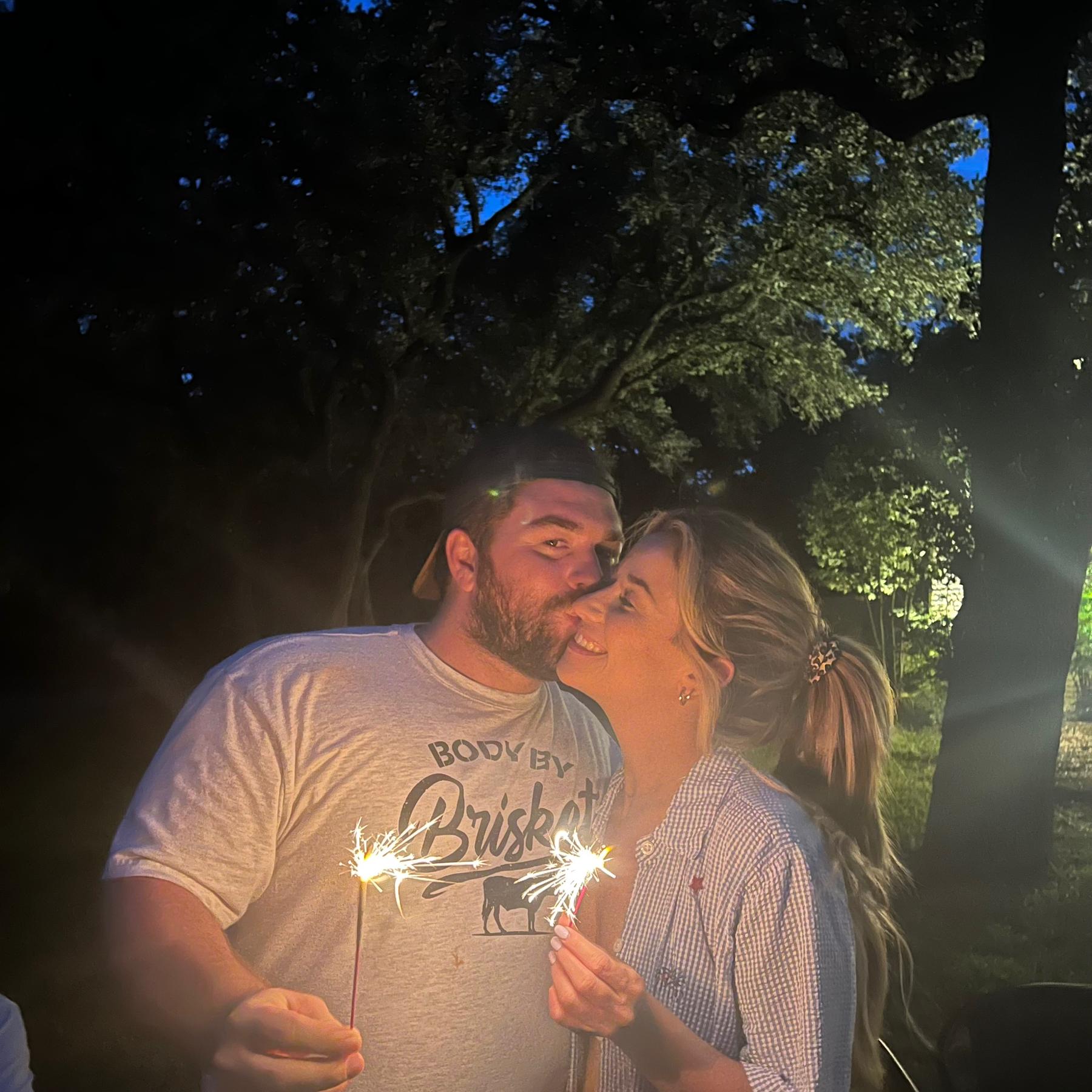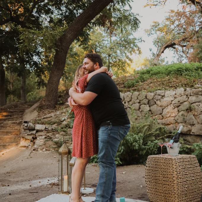Drew took me out to celebrate his birthday at Salt Grass (where we had our first date) We talked about getting ice cream, went to Cameron Park and on the way there, he asked, “When and where would you want me to propose?” I said, “I didn’t care as long as we’re in front of family!” And then he drove us to the park and we got out and walked up the stairs that led to a table with a bouquet of roses, a bucket of ice with champagne in it with two pink glasses right by it! I started crying and said “Babe!” So many times cause I just realized what was happening! I said yes and I hear car horns and people cheering and I see Lily (Drew’s sister) taking pictures and our parents walking up to congratulate us! We leave the park and I get surprised by a surprise engagement party at Drew’s parents house with a lot of our loved ones!!