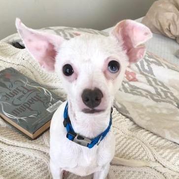 Bubba Bean is a 5 pound albino Chihuahua with one blue and one black eye. He was rescued almost 2 years ago from an abusive situation in California. He was transferred up to the Oregon Dog Recuse, where Madeline adopted him. He brings Madeline SO MUCH joy, and he is her shadow. In his spare time he enjoys long walks, the sunshine, burrowing under the covers and cuddles.