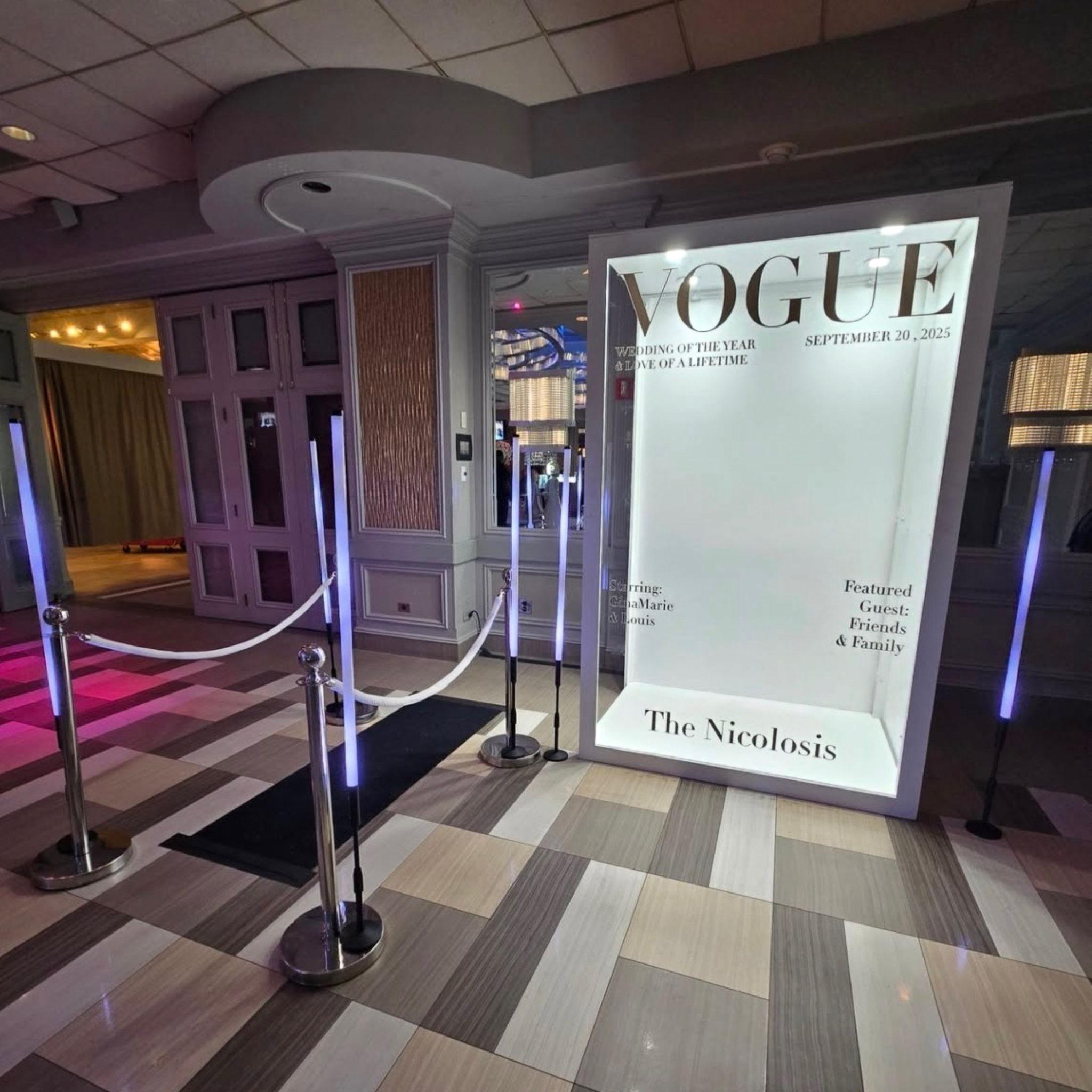 A magazine-style photo booth will be available for guests to take timeless, editorial-style photos throughout the night. The booth features custom text and design elements inspired by the wedding, creating a polished, keepsake-quality photo experience. A professional photographer will be present to assist guests with posing and framing to ensure each photo looks its best. The space comfortably accommodates couples and small groups. Larger groups may also step in for photos with slight adjustments. The booth is ideal for capturing elegant portraits, candid moments, and memories with family and friends.