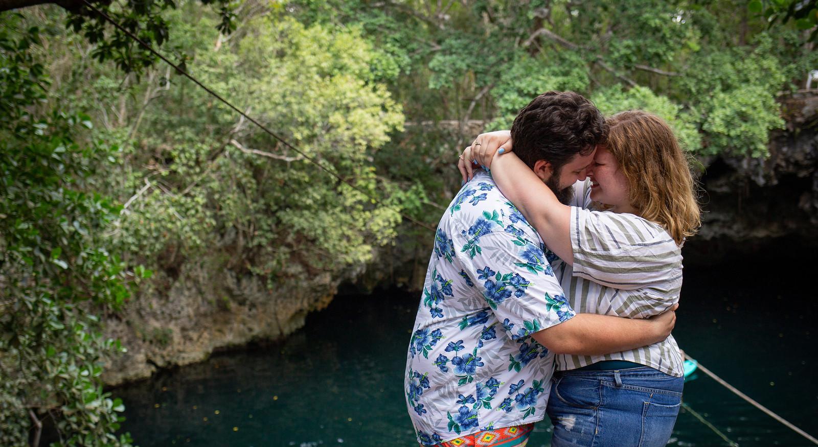 We took a trip to Mexico to a beautiful all inclusive resort in Rivera Maya to celebrate our first anniversary and Max graduated from his Master in Bio Medical Sciences program. On the morning of our excursion day where we planned to go to a Cenote with zip lining, I woke up to a letter next to my bed that Max wrote to me the day after our first date. Obviously I knew this was normal romantic Max behavior but had my guesses that the proposal was happening today. We walked to the lobby to pick up our rental car, which is where Max handed me the next letter, written a few weeks after we started dating, where he wrote down that he would marry me some day and would like to propose is a beautiful place like Mexico. Max came over and I was SOBBING on the couch as I finished the letter. Max not remembering what exactly was said in the letters filled with love was confused to find me like that, but I encouraged him to keep moving with the day and we were off! We arrived at the Cenote, a sinkhole that has filled with natural water, and had a wonderful time swimming, zip-lining in the water and cliff jumping. When it was time to go, Max pulled me back to look at the gorgeous scenery one last time. It was there that he proposed. That I said yes. Once back in the car, he handed me a bundle of letters that were filled with his love and that documented all of the beautiful monumental moments from our relationship. I was floored by his perfect planning.