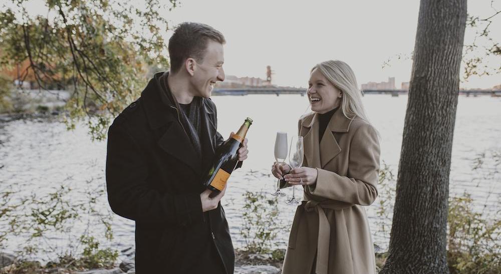 Sonja likes to say that it was the most surprised she could have been for it not being a surprise at all. Sonja and Max talked for a long time about getting engaged. They talked to each other, they talked to couples in their life that they look up to, they talked to a couples' coach (highly recommend - ask them about it!). And together they made the decision they were ready to take their relationship to the next stage. But how to actually do it? They picked out the ring together, and at that point, Max completely cut Sonja out of the planning. He told her the first two weeks of November leading up to her birthday were totally reserved -- a romantic gesture would happen every day, but she never knew which day would be "the" day. One evening they cooked together, one evening Max got them a private dance lesson, one day he got them back into Sonja's university house courtyard, where they once spent so much time plotting world domination on a hammock. He let a few details slip, enough so that Sonja assumed she had figured out exactly when it was going to happen (November 7th), and where (Rhode Island). She was so confident, in fact, that when Max completely changed plans 36 hours before November 5th, she never saw it coming. Max told her to get dressed up and be ready to leave the apartment at 4:30pm. They started walking around the Boston Esplanade, towards a specific outcrop overlooking the city where the couple had spent their 3rd anniversary (locked down during Covid, they brought a thermos of champagne and sat on a bench to watch the sunset). When they arrived at the specific spot, a picnic blanket was set up with champagne and flowers. We think you can guess what happened next...!