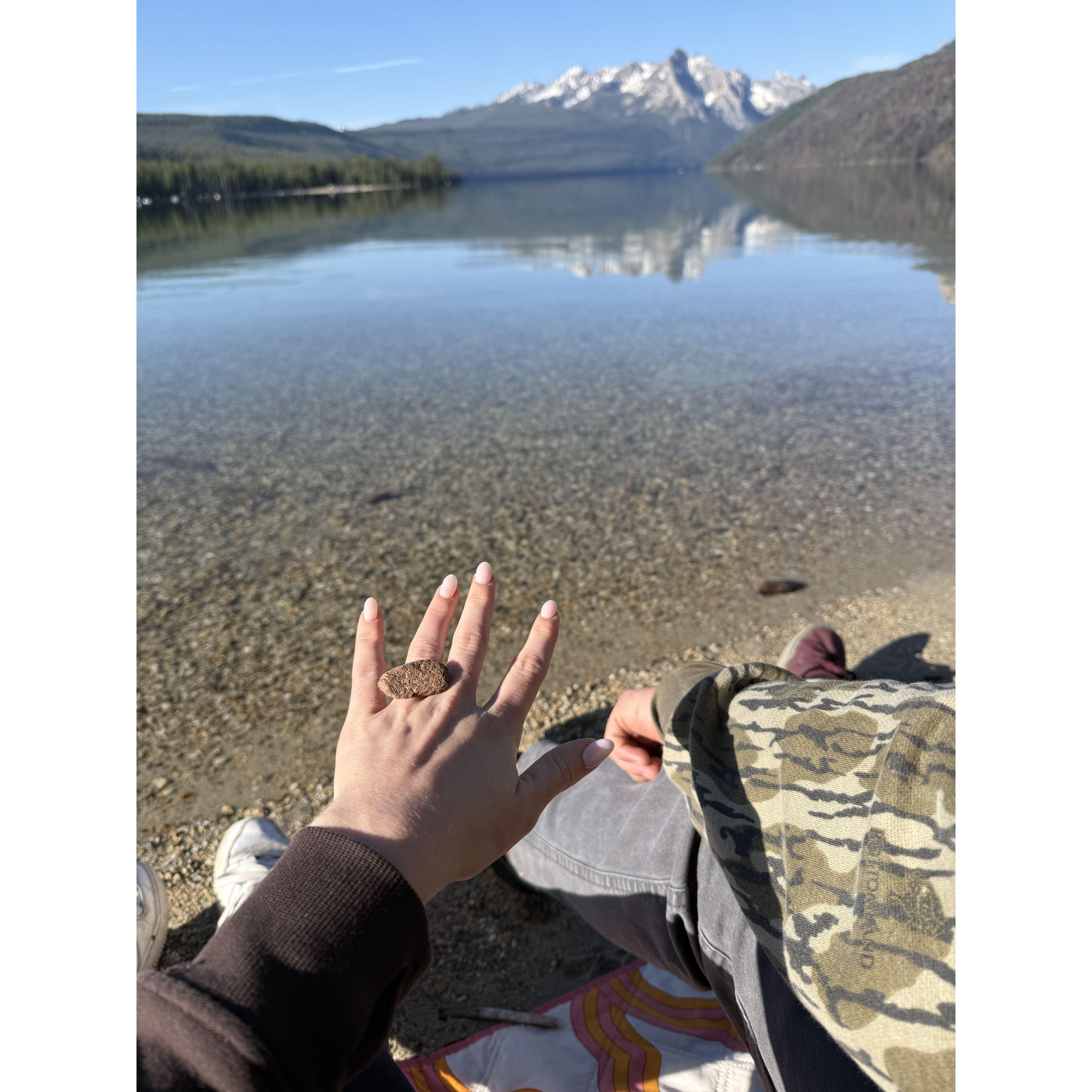 Marshal proposed on 6/14/25 "penguin style" with a rock at Red Fish Lake, ID!