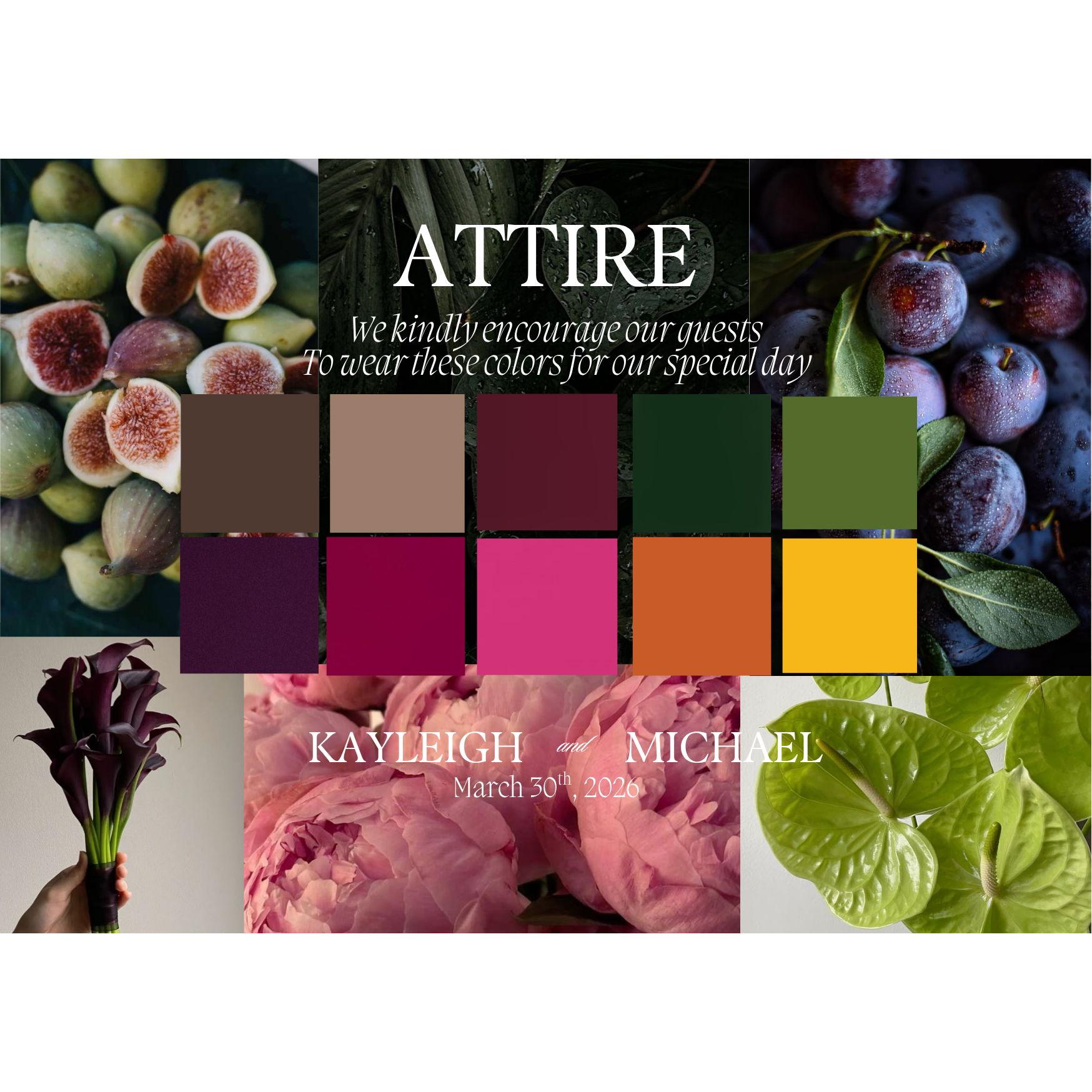We’re so excited to celebrate our special day with you, and we want you to feel your best while honouring the atmosphere and colours of the day. Here's a little guidance to help you plan your outfit: