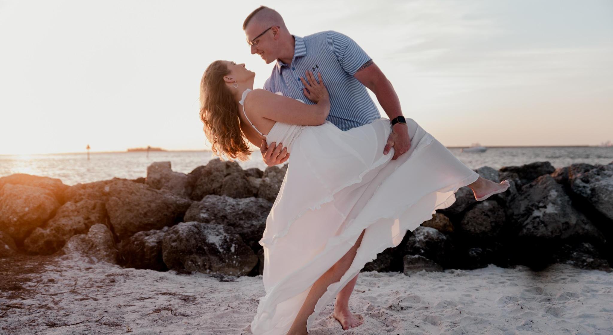 We had plans to go to this restaurant called The Sandbar on the beach in Ana Maria Island. I did not feel good the day Zach proposed and just wanted to stay home with no human interaction; but Zach's family was visiting from Pennsylvania and we were getting family photos taken, so I had to make myself presentable while having some suspicion. I was not going to get my hopes up until I saw him on one knee. While shielding my eyes from the sun, I hadn't noticed Zach and his dad exchanging the ring from one another so Zach could put it in his pocket. Before I knew it, Zach says to me, "Hey, you knew this was coming" and proceeds to get down on one knee. I tried to say, "Yes" but my voice was basically gone at that point from my sickness so I just started shaking my head uncontrollably. Everything happened in a blur. Best day of our lives!