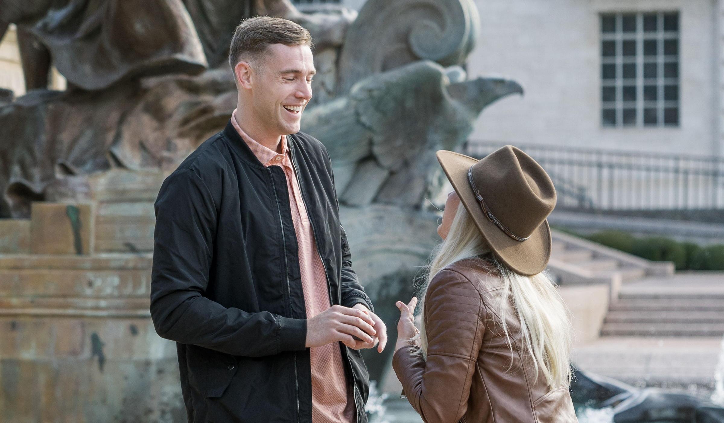 Morgan and Mac met in the fall of 2019 while Mac was out in Austin with some of his basketball teammates from West Point. It was no surprise that their group ended up on west sixth street at a bar called The Ranch. The Ranch was no foreign territory to Morgan who had been tearing up the dance floor every Friday or Saturday during her time at The University of Texas, and that was exactly what she and her friends were doing the night Mac and his friends were out. The two spotted one another from across the bar, but it was no surprise that Mac was hesitant to approach Morgan. As his friends drifted away to catch their Uber, Mac threw up a wave, and to his surprise, Morgan excused herself from conversation, walked up to him, and greeted him with a firm handshake and her number. Mac texted right away, but Morgan was preoccupied with Texas football and in no rush to respond until the next week when the two planned to meet for their first date. Soon they were spending every weekend together or meeting in Georgetown for dinner dates during the week. The only silver lining to a global pandemic starting in the spring of 2020 was Morgan being able to spend more time at Fort Hood with Mac before his deployment to Afghanistan in June. 5 months trudged by, but Mac returned to Texas after flying himself back to the US, and the two knew that this was the beginning of forever. Thanksgiving and Christmas of 2020 were split between the two families, and Mrs. Hoffman and Mrs. Zamen were ready to start planning a wedding! There were many opportunities for Mac to propose, but he was set on having all members from the both families there to celebrate. A week before Thanksgiving of 2021 Morgan and Mac helped Mr. and Mrs. Hoffman make their big move from California to Texas in a three car caravan. After a few days, they finally made it to Georgetown, Texas where they were greeted by Mac's older sister. On Thursday, both families enjoyed their first Thanksgiving dinner together, and the next morning Mac was getting down on one knee in front of the Littlefield Fountain at The University of Texas before the Texas Vs. Kansas State football game- the very same college football matchup from the weekend they met in 2019.