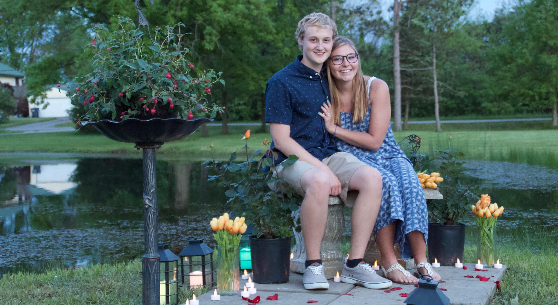During quarantine, we hadn't gone out for a date in a very long while, but on this particular Sunday, Joe said we were gonna go out for a nice date! I didn't think a whole lot about it because he was very nonchalant and relaxed all day. We went to church. We went to Uncle Will's house and hung out at the pool. The weather couldn't have been better. We got dressed and set off on our date at 6pm. Though the sushi bowl restaurant was closed, we were able to wait a half hour to get some takeout pizza. Surely, I thought, if anything were going to happen, the plans would be foiled because we had to wait for pizza! We went out to the Reservoir and had a picnic by the water. Then, we were supposed to go out to the Wrisley's house at around 8pm to play cards. (We didn't play cards in case you're wondering). When we pulled up to the house, Joe wanted to go look at the flowers the Wrisley's planted next to the pond, despite my persistence in needing to go inside and use the bathroom. He moved swiftly and led me out to a lantern lit, rose petal strewn, absolute dream proposal. Through the tears I said yes. We were able to share our engagement with close friends and family, and we'd love nothing more than our wedding to be the same. We look forward to sharing our day, our love, and life with you!