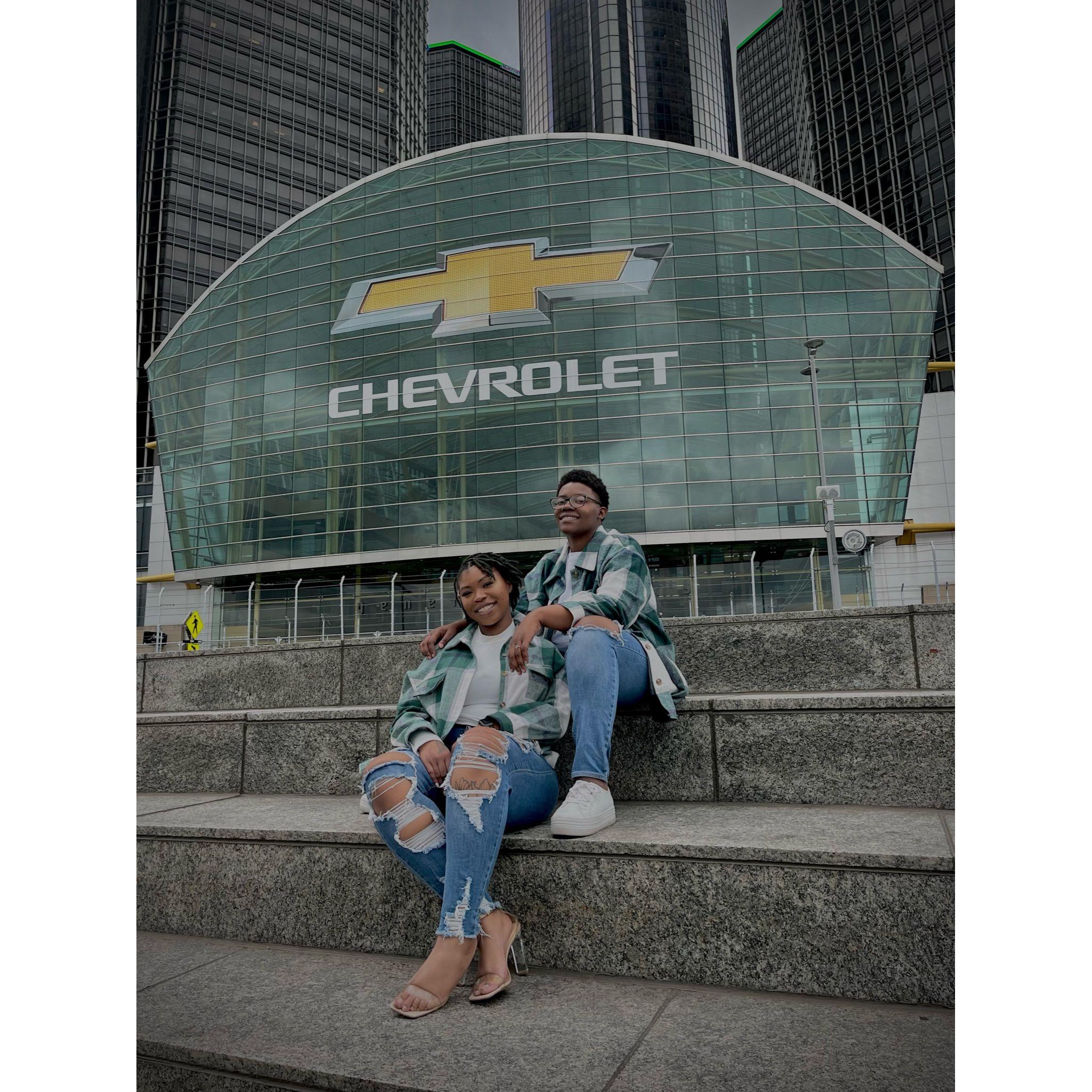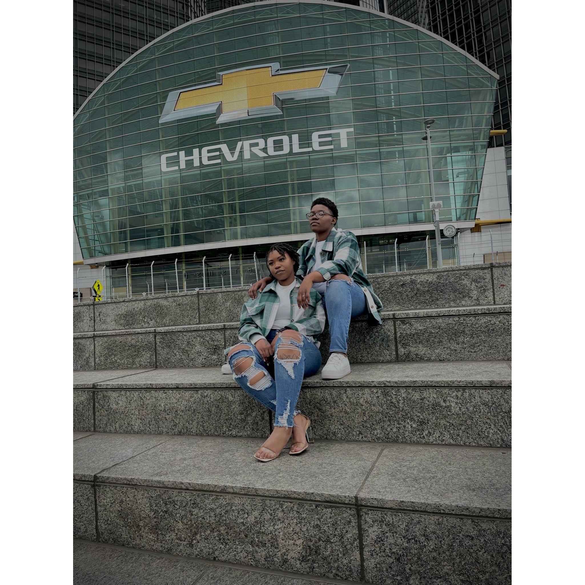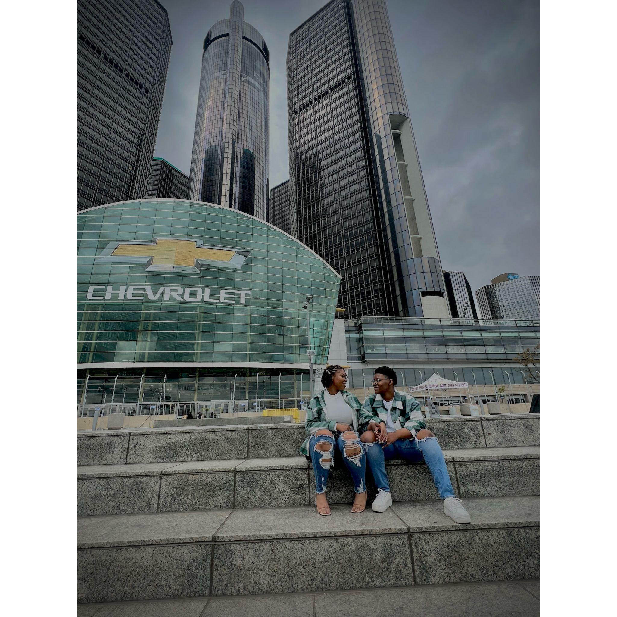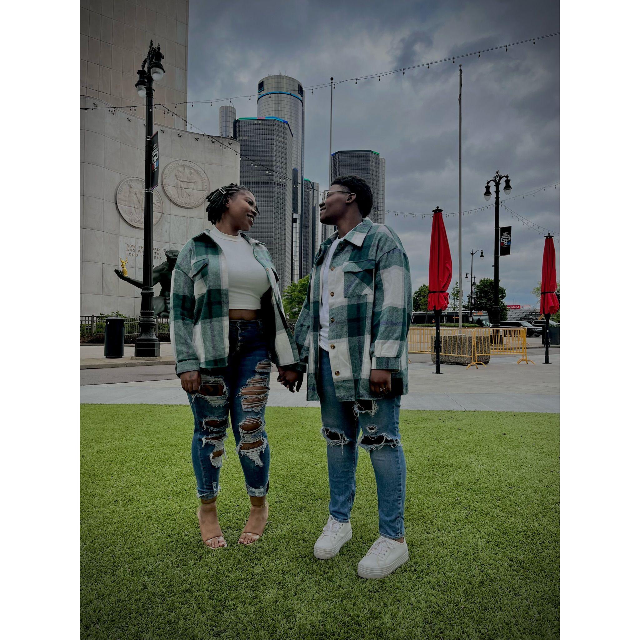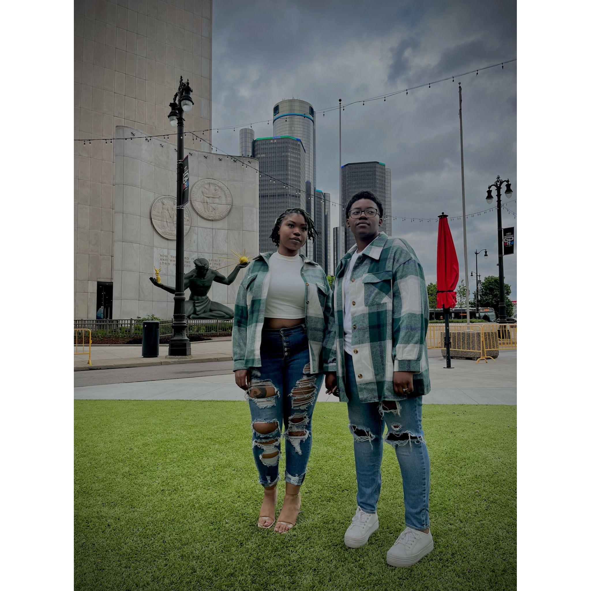 Standing in Hart Plaza, pictured behind us captures the essence of Detroit! To our left is the "Spirit of Detroit", and the GM Renaissance Center is directly behind us.