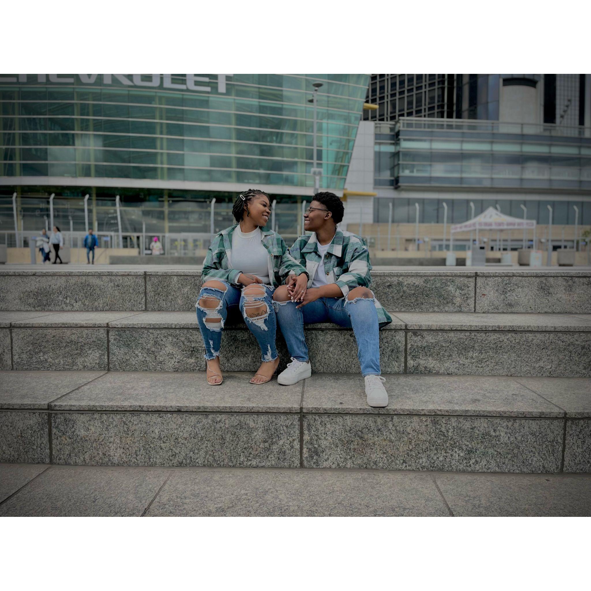 On the steps of the Riverwalk, along the Detroit River, overlooking the border of Canada.
