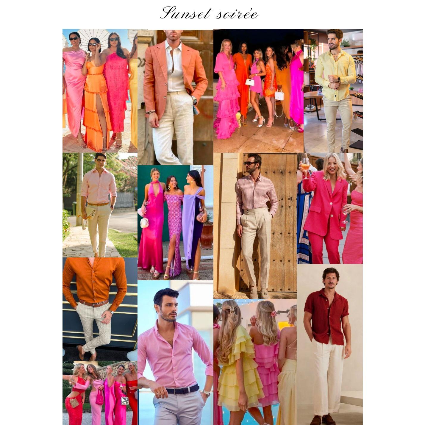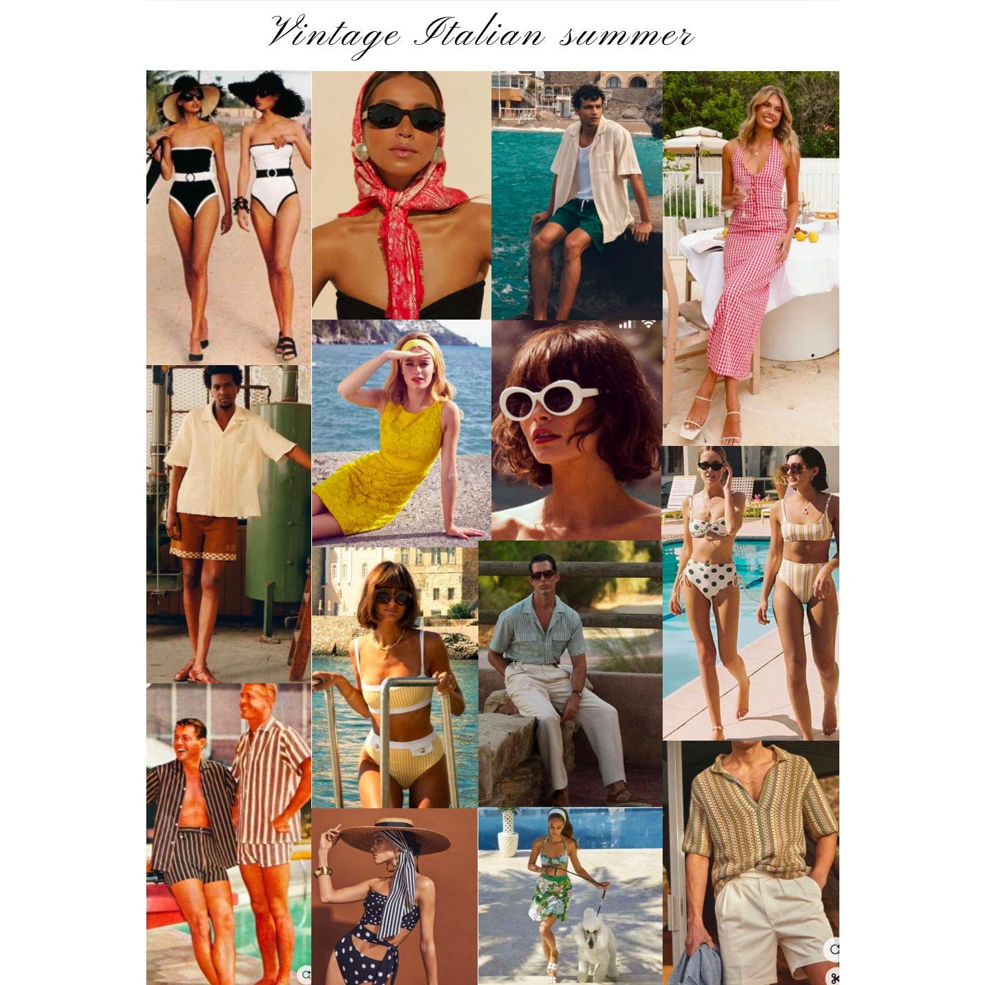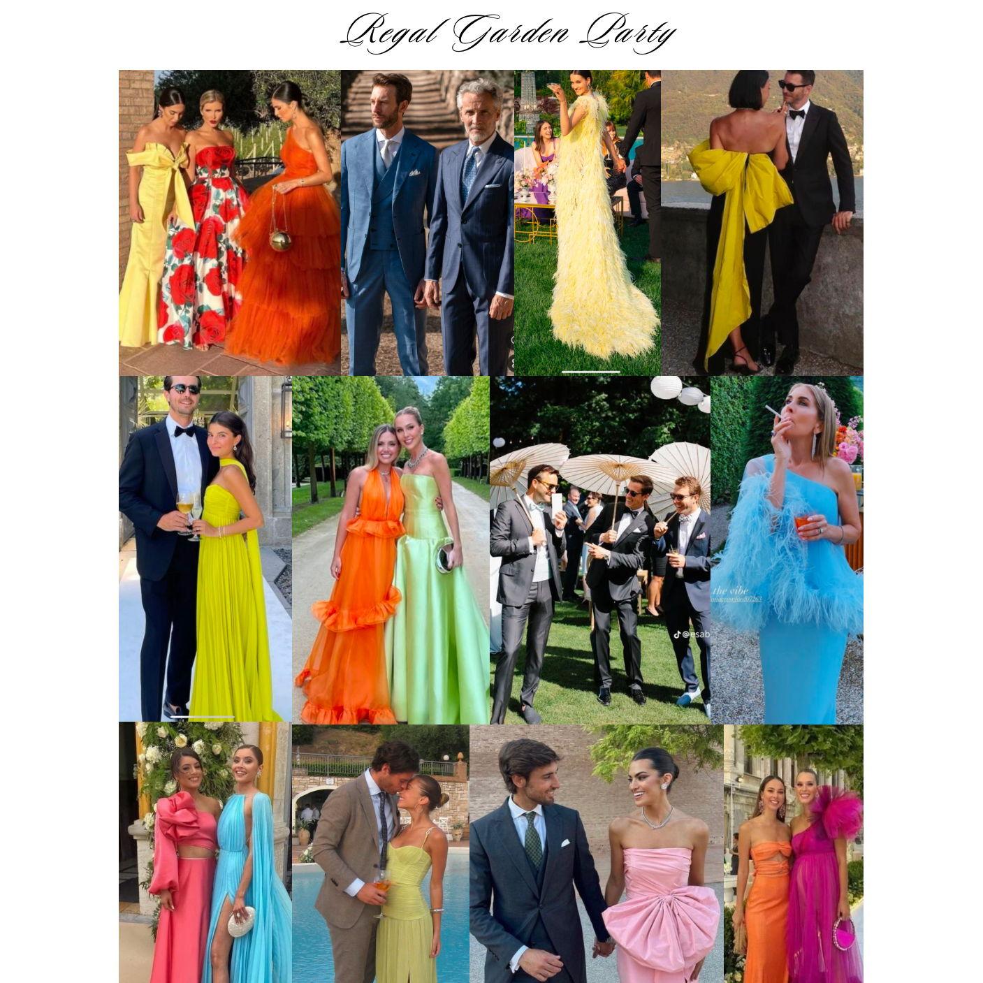 Outfit inspiration for the wedding weekend (click on image to expand). REHEARSAL DINNER: Sunset soirée WEDDING DAY: Regal Garden Party POOL & PIZZA PARTY: Vintage Italian Summer