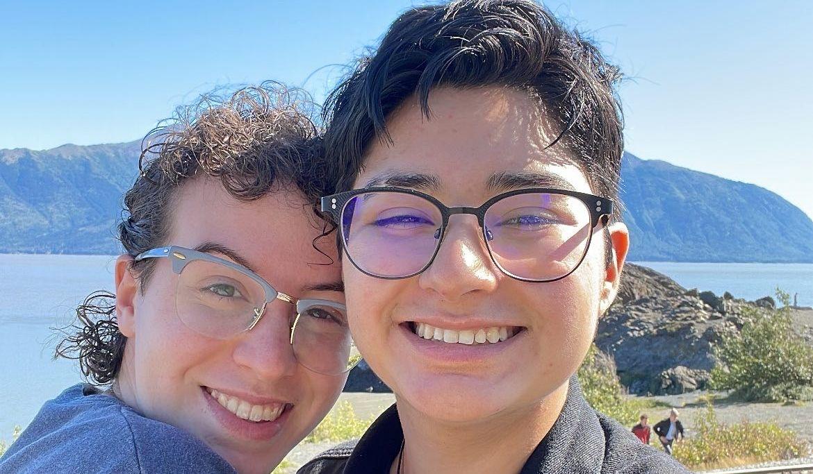 While still in lockdown, we each decided to download Bumble in hopes of finding a connection. Salem caught Percy's eye with the soft, plant dad aesthetic and Salem fell for Percy's punk and dog pictures. Less than 15 minutes later, they had a first date plan. A personal record for both! What was meant to be a quick boba trip and an art museum date turned into a 9 hour conversation at Hella Bubble and Wingstop. (A year and a half later we finally went to the art museum!) Topics ranged from career goals, high school stories, favorite cave creature sounds, queer rights, and everything in between. By the time we checked our phones, the art museum was closed! Time really did stand still for us. Percy went home with a smile so big, his face was sore the next day. Salem went home feeling much the same way. Two weeks later after their second date to a local aquarium, Percy asked Salem to officially be their joyfriend. And the rest was history!