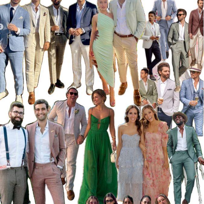 Men: A lightweight suit made of materials like linen or lightweight wool is ideal. Colors: Light-colored suits are a great choice for daytime events.