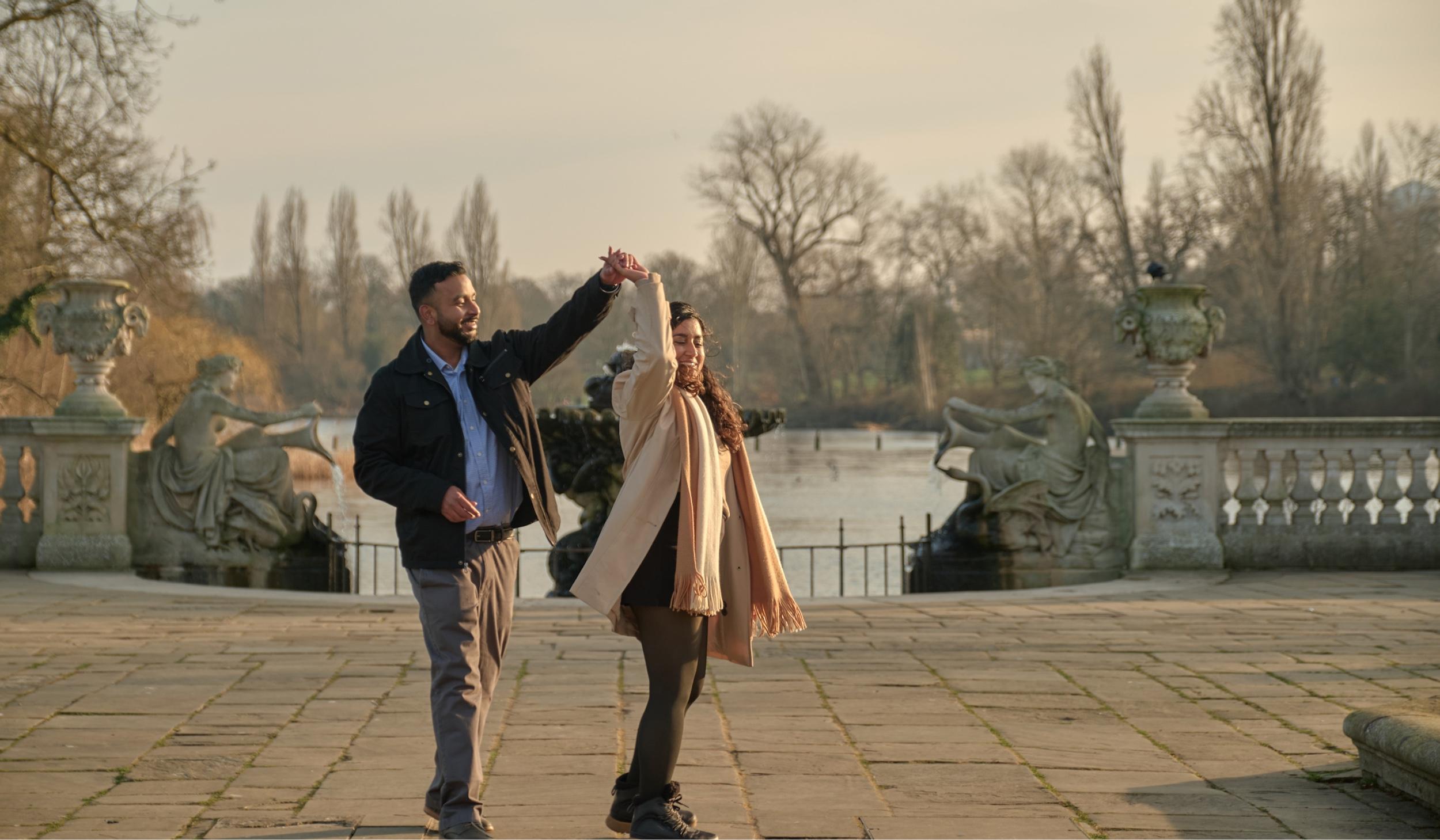 To celebrate two years together, we decided to take our first international trip to London. During one of our days there, Shishir insisted on a surprise excursion, and said he had something special planned. We traveled to Kensington Palace (the late Princess Diana's home) and went into the gardens. There we conveniently "bumped" into a barbershop quartet who serenaded us with "Beautiful Soul" by Jesse McCartney- one of Rhea's favorite songs! After they sang, Shishir went down on one knee and popped the question! Rhea enthusiastically said yes, and the rest is history.