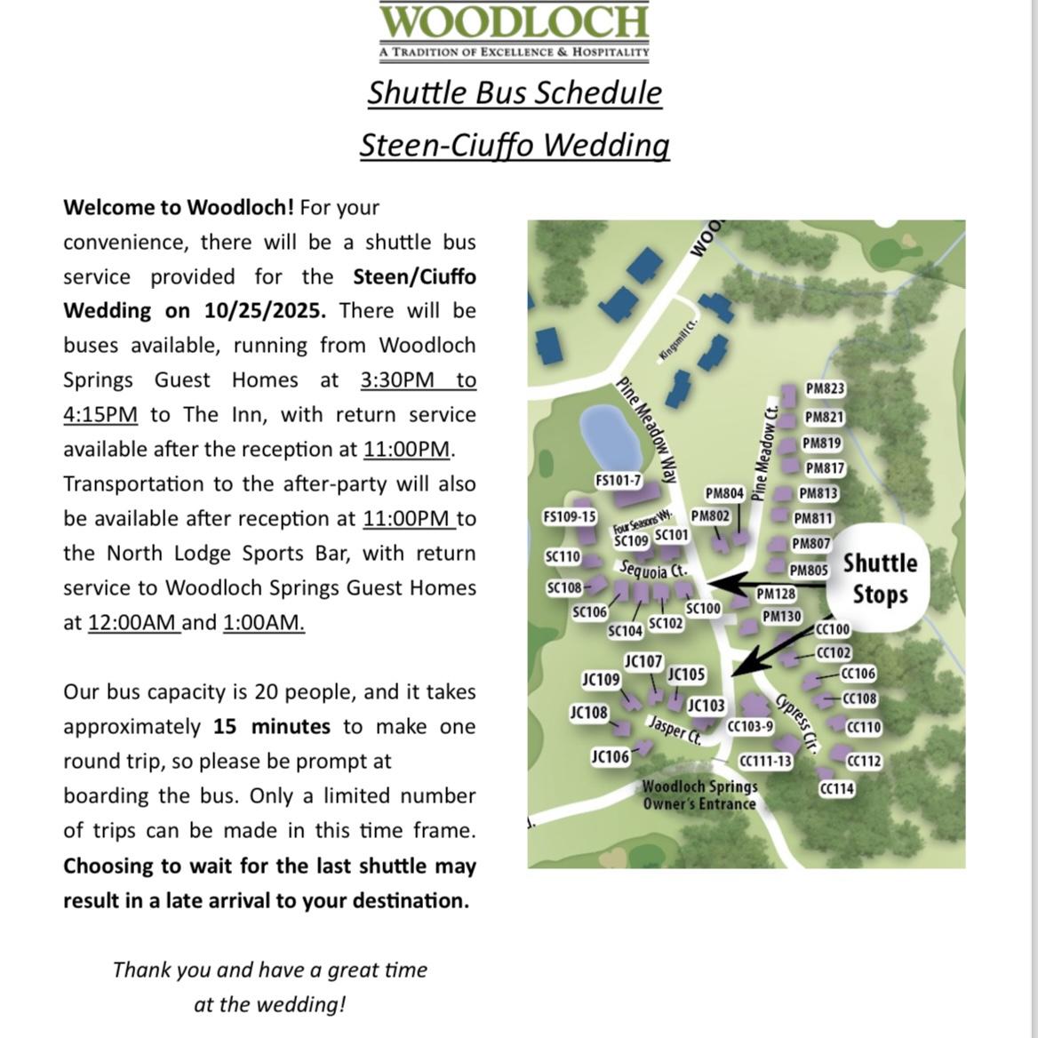 11:00 pm (or earlier, if needed) - Pick up at the reception to drop guests off at their rental homes, or to the North Lodge at Woodloch Pines after party