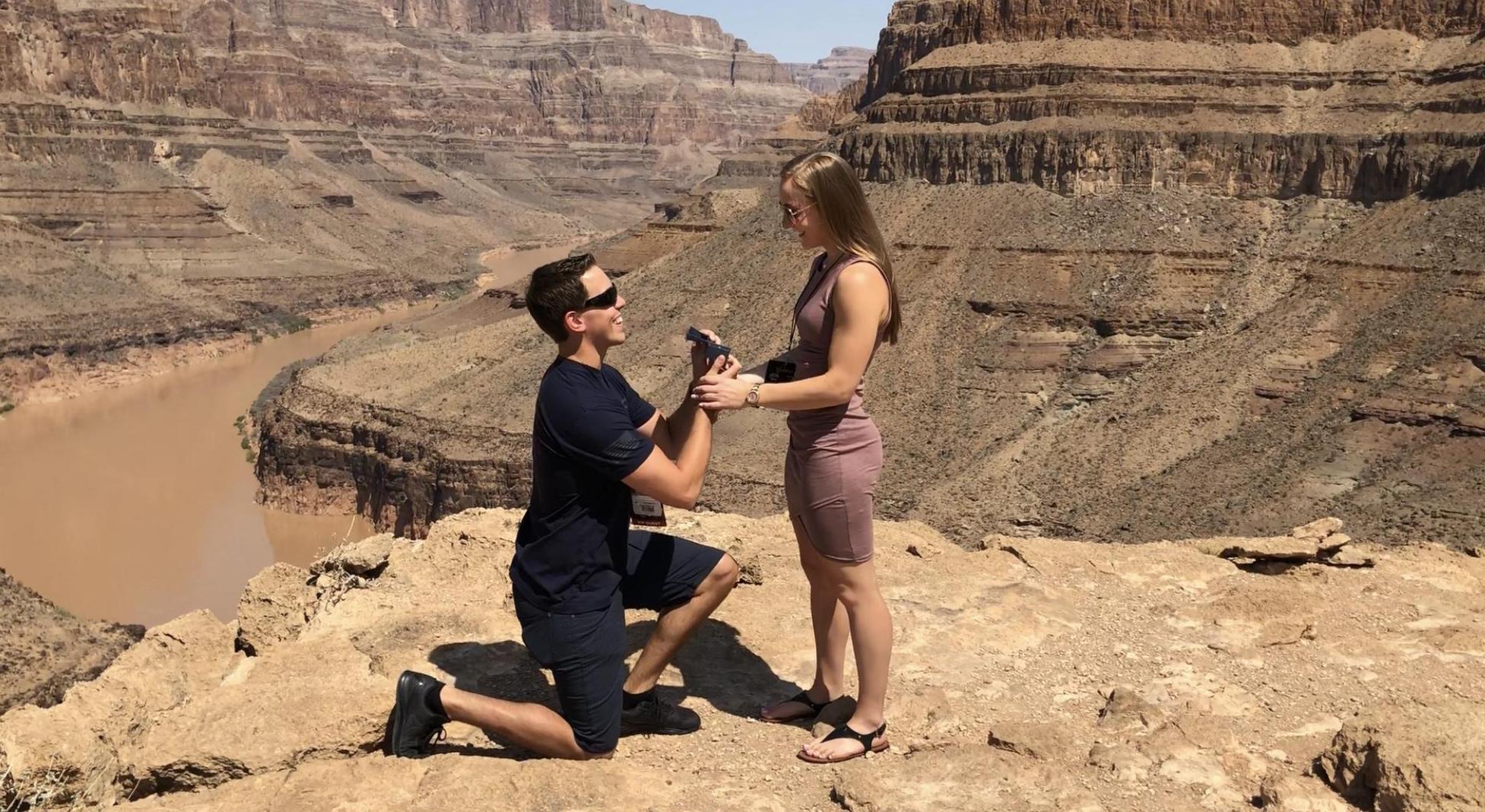 Ever since nursing school, I always told Kelsey that we will get married after school. October 2017 was the time to finally pick out the ring. We went to Coughlin's jewelers and decided to look around. Kelsey's eye managed to find the shiniest ring in the place. Fast forward to our third trip to Vegas, July 26, 2018. This was the vacation. The vacation that would set up the rest of our lives. Kelsey wanted to take a tour of Vegas and the Grand Canyon with a helicopter since our first trip to Vegas. July 27, 2018 I decided to book Sundance helicopter to take us around the Hoover Dam, Lake Mead, the Grand Canyon, and the Las Vegas strip. The helicopter landed in the Grand Canyon just above the Colorado River. After building up some courage and trying to relax my nerves, I asked the woman of my dreams to marry me. Fortunately, she said yes! Kelsey, being very family oriented, wanted to call her mom and brother right away, but with my quick wit, I said: "why don't we wait to get back to the room". We got up to the room and opened the door and SURPRISE my mom, dad and Kelsey's mom surprised her with showing up to Vegas. It was a wonderful vacation with even better memories made. We cannot wait to make more memories with all of you at our wedding.