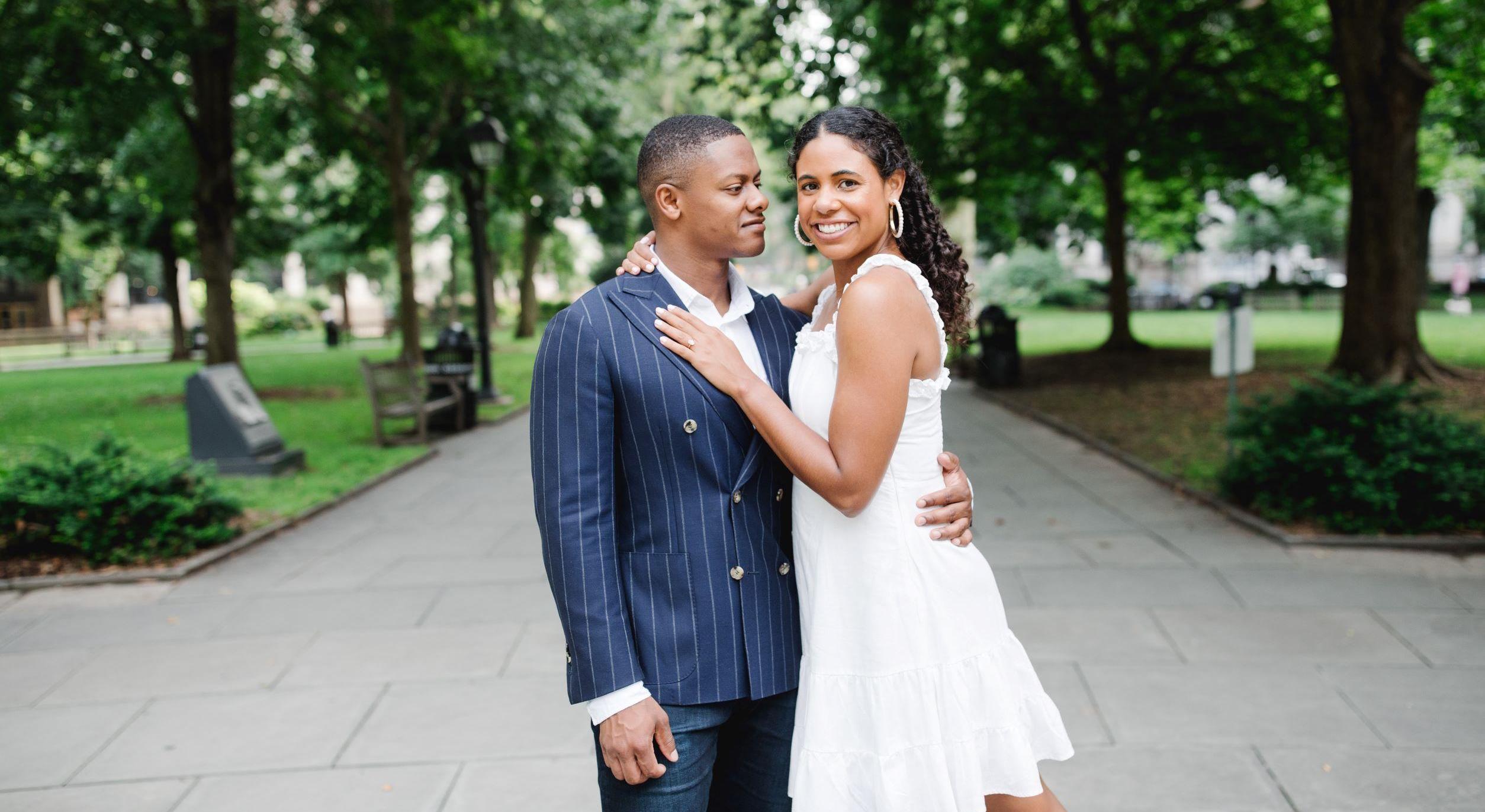 Taylor thought that she and John were on their way to meet up with a few friends for dinner. The rain seemed to be holding off for the time being, so they took a route that had them walking through Rittenhouse Square (one of Taylor's favorite spots in Philly) ! They came across a cartoonist and John suggested sitting down to have a sketch drawn. Music started playing and their family and friends - who were hiding in the bushes behind them - started to creep up a little closer. As the artist turned the sketch around, John got down on one knee and Taylor shouted YES!