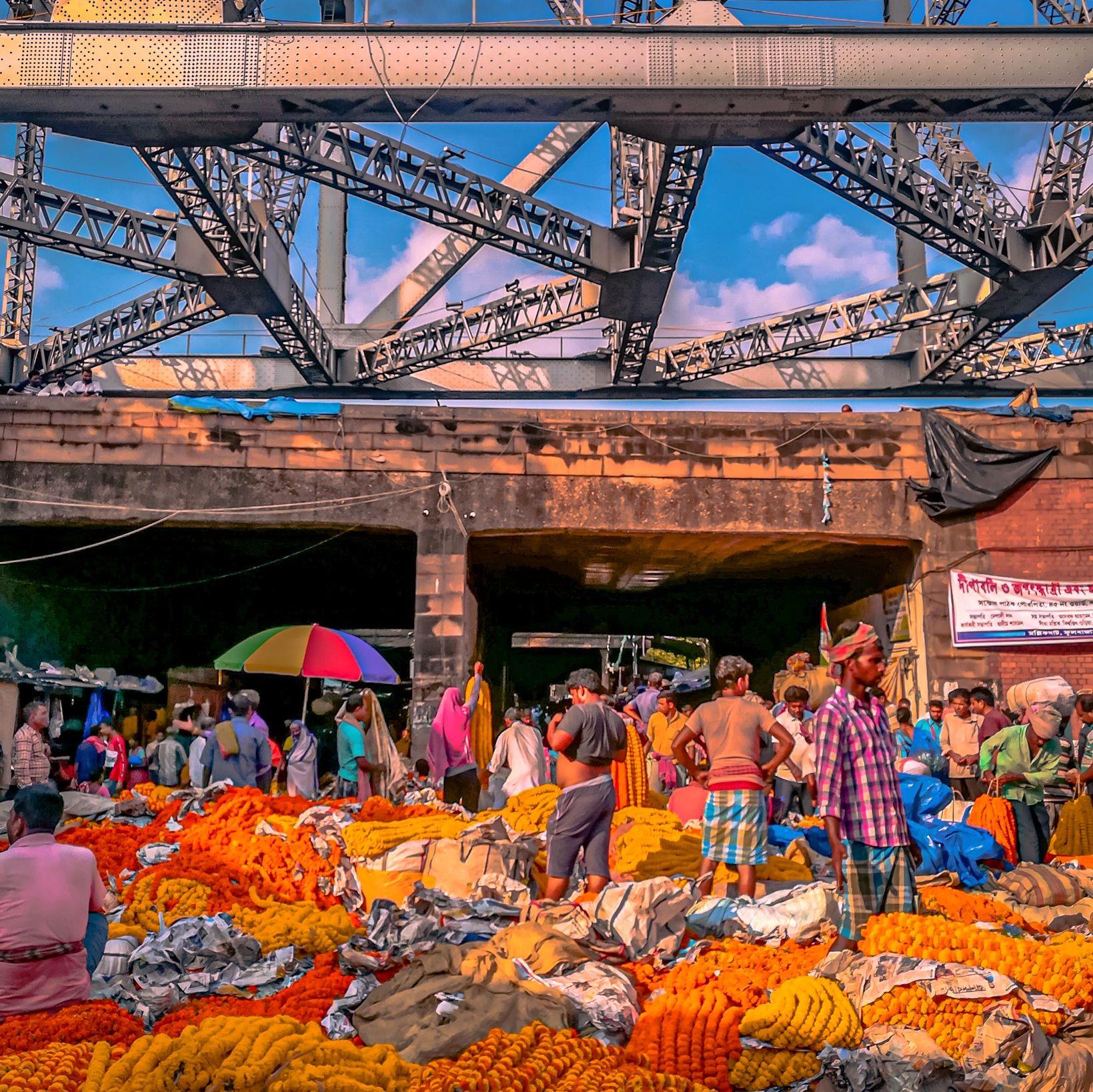 Nestled beneath the Howrah Bridge, this vibrant riverside market bursts with colour and fragrance every morning, as hundreds of vendors trade garlands and blossoms in one of Asia’s largest flower markets.