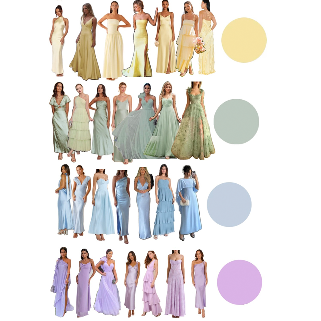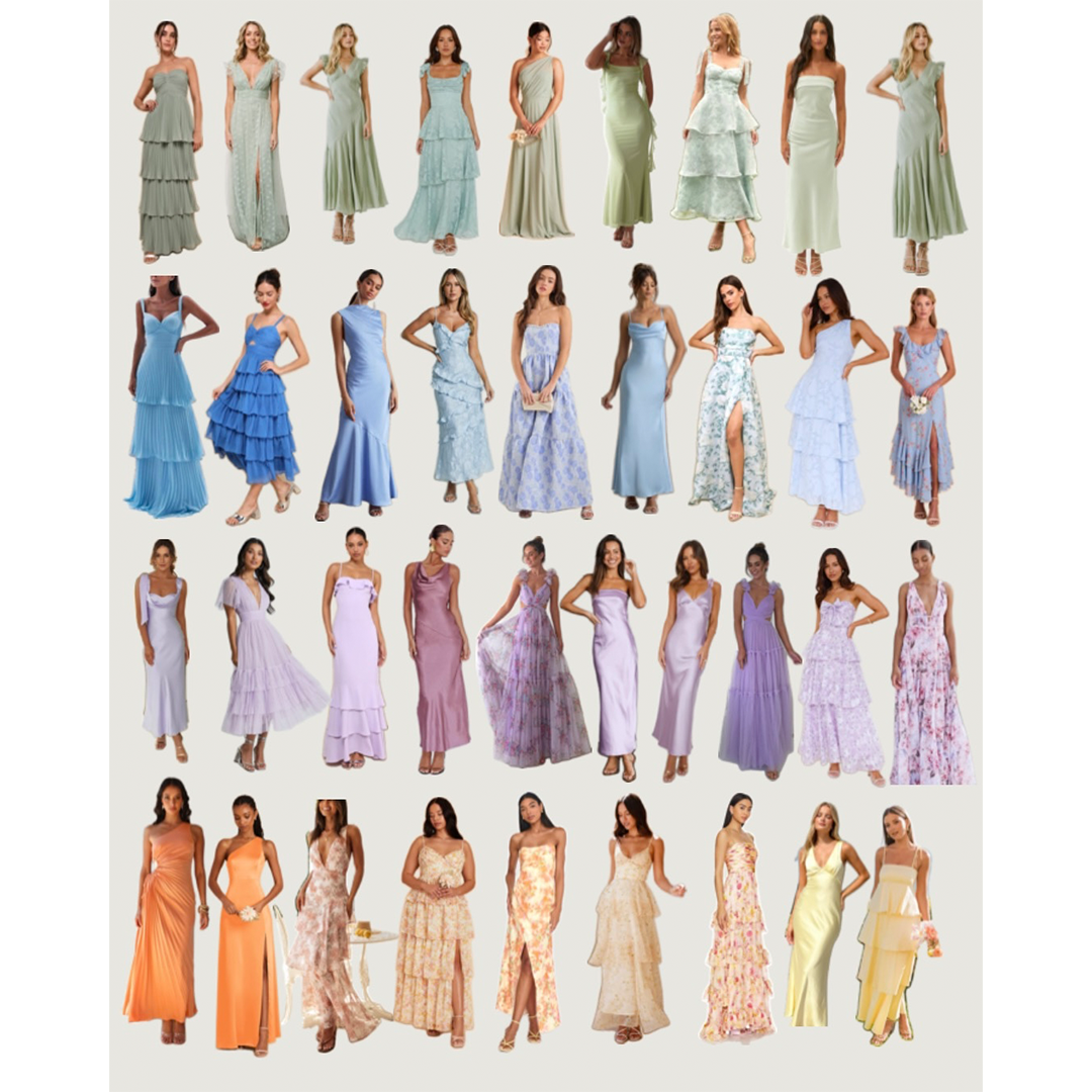 Spring-inspired colors such as yellow, orange, lavender, purple, blue, and green are encouraged. To keep our bridal party colors distinct, please avoid pink, as it is the bridesmaids’ dress color, and avoid white out of respect for the bride.