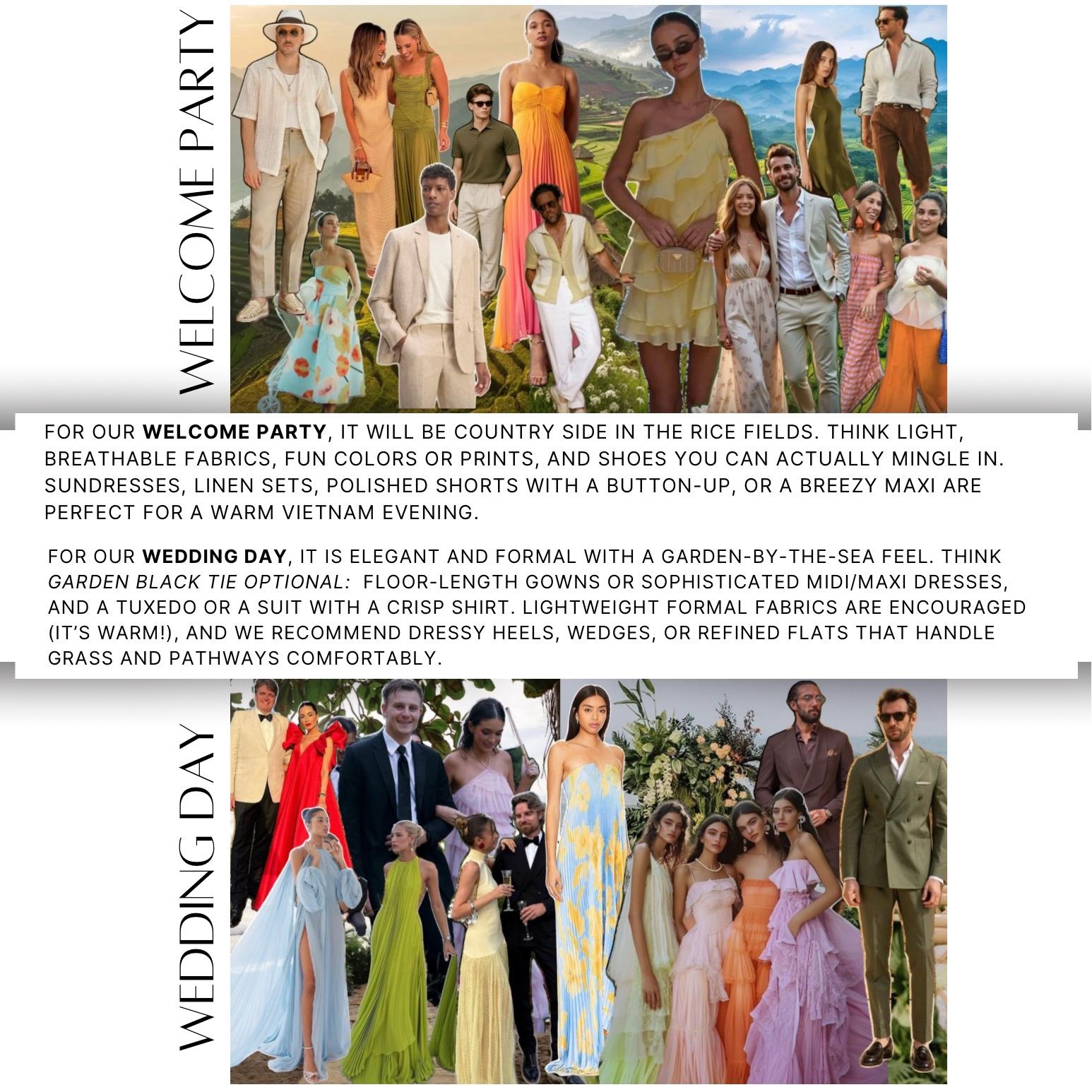 Vietnam will be warm, choose breathable fabrics & shoes you’ll be comfortable walking on grass in. To help with packing, we’ve created mood boards for our 2 events so you can get a feel for the vibe (and what to wear) each day.