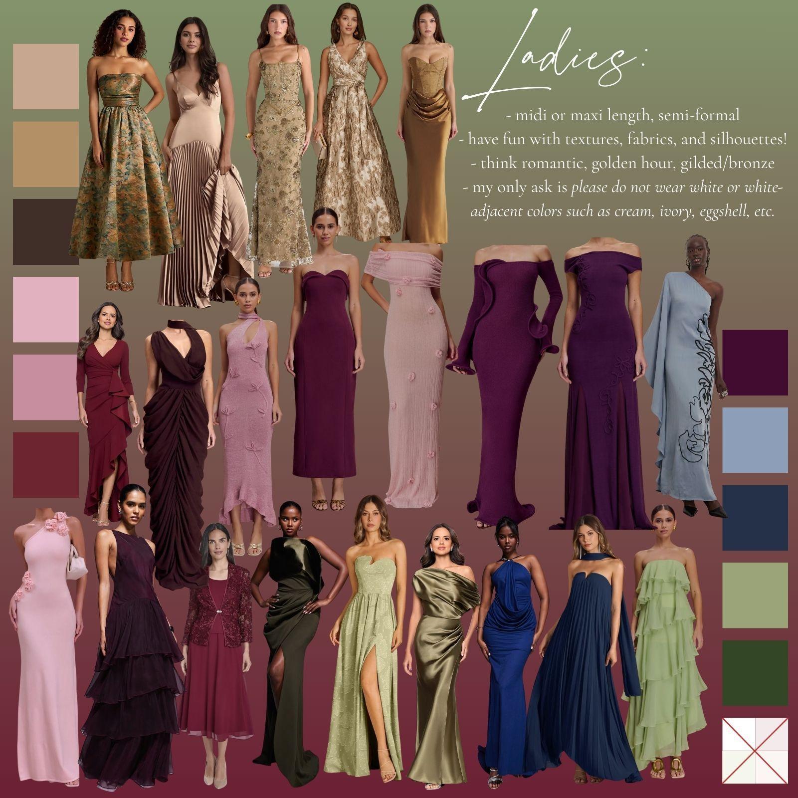 To expand on the dress code description that was included in your printed "Details" card, we wanted to provide some curated visuals to assist with envisioning the 'Enchanted Garden Formal' theme. We encourage you to have fun with the attire, the below photos are simply inspiration!