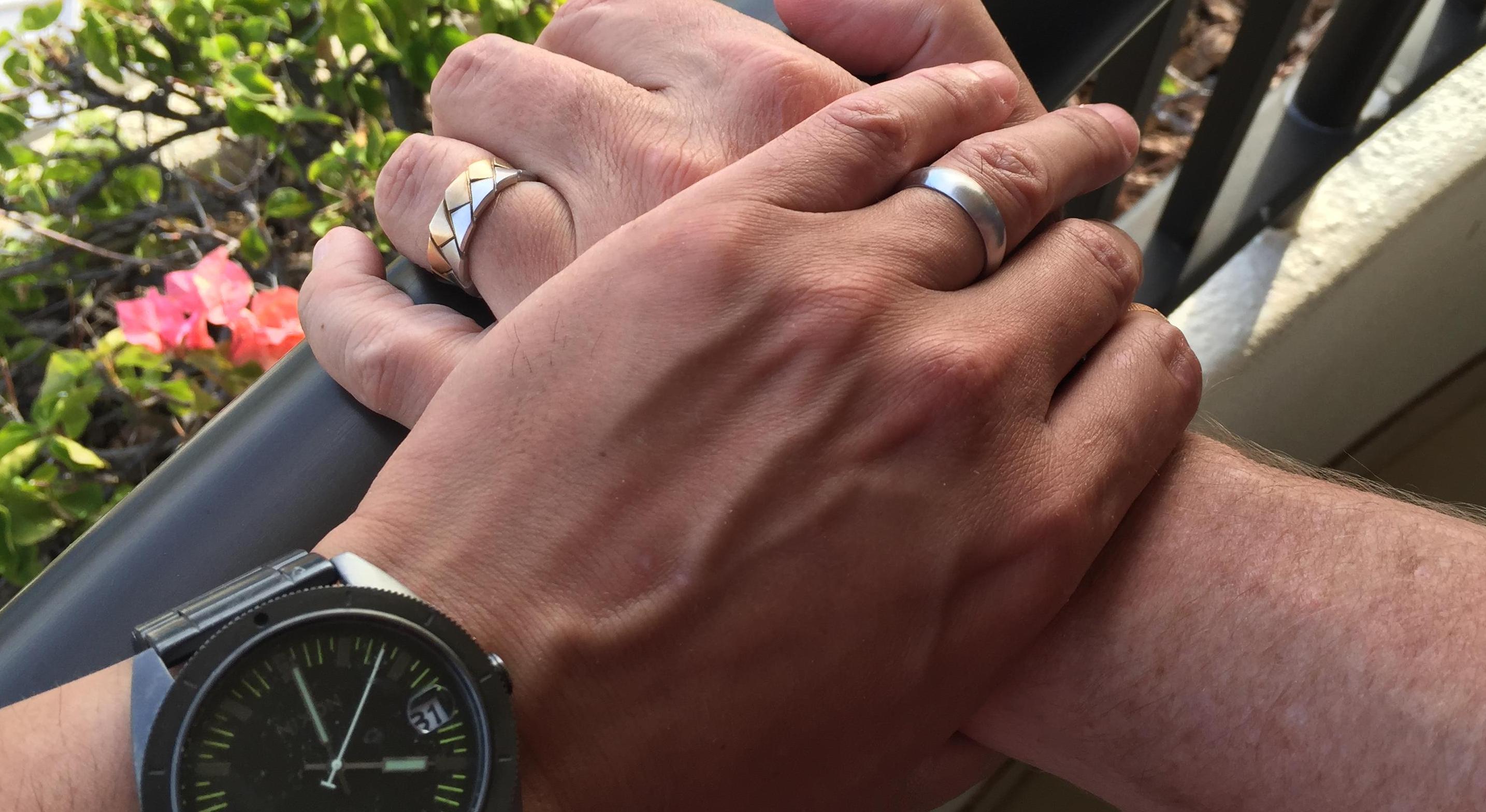 There was no doubt early on that we were committed to each other. You just know when something is supposed to work, even on days when it takes a little extra work. But finally, after secret planning on John's part for some time, one day when hiking down to the Olivine Pools in Maui during a recent vacation, it became officially official when John popped the question and presented Vince with a ring (which we had bought together several months earlier in Ventura: we said we knew it was a sure thing, after all). This time Vince was surprised, truly. We had waited, mostly because of Vince's stubbornness, until a time when it was legal in all 50 states for the two of us to be married. That time came and passed, and life happened as it does on a daily basis, and the right moment came on the right day in the right place, to take the final steps to make it complete. Halloween was a good day for a treat.