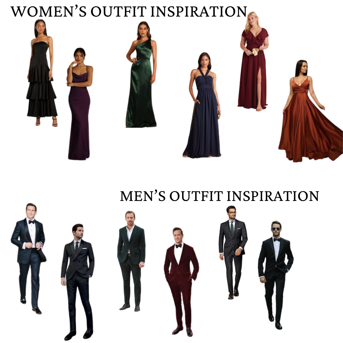 Floor length dresses in jewel tones (see above) or black. Appropriate dress shoes.