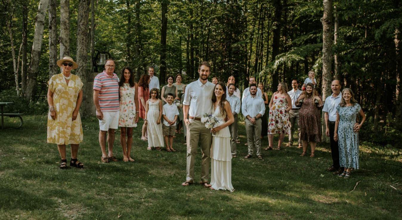 After making the decision to postpone our wedding celebration in the spring of 2020, we decided that although the celebration could wait, the marriage could not. With the flexibility, generosity and creativity of our family and wedding party members, we quickly reimagined the day from a 250-person gathering to an intimate, 23-person day. Sitting on the shores of Grand Traverse Bay, Shady Trails Summer Camp became our new venue, and the beautiful, rustic cabins and lush green woods surrounding it set the backdrop for the start of our forever. Although we so were looking forward to celebrating with everyone this June, we simply do not feel comfortable encouraging more than 250 friends and family from near and far to gather together so soon. We are so grateful for your friendship, understanding and well-wishes as we continue on our married journey together.