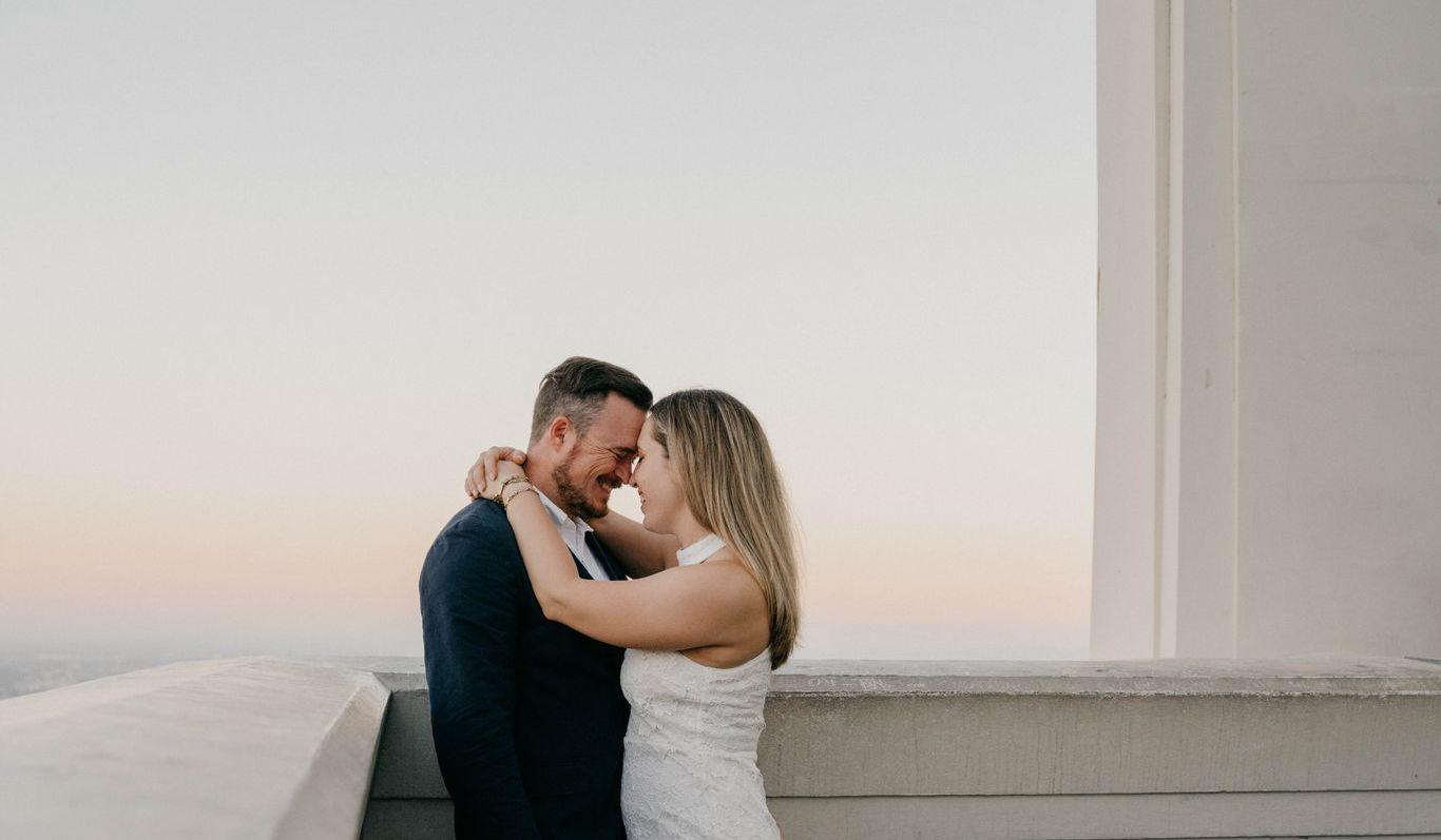 Brandon always wanted a surprise engagement. After surreptitiously shopping, buying and accepting delivery of the engagement ring, Brandon needed the proposal to be a surprise as well. Brandon and Alysha began dating with day trips to Los Angeles. Whether it was going to watch movies at the ArcLight Theater in Hollywood, sight seeing at the Griffith Observatory, or hunting for the best BBQ, LA is where all their initial memories formed as a couple. Brandon mulled over numerous options for a beautiful and meaningful proposal site - the Getty Center, the Griffith Observatory… but his mind always returned to the ArcLight, where they saw countless movies and shared their first kiss. Unfortunately, the ArcLight was one of the many theaters that did not survive the pandemic. With no new movies playing, there was no specific reason for Brandon and Alysha to go there. As such, a pretext was needed to get Alysha out to LA and it needed to be an important one since Alysha was planning to pack before her trip to Minnesota. Brandon was lamenting this dilemma on a call with his boss and she immediately had a great idea: Brandon’s firm was in the process of moving their LA office so Brandon could tell Alysha he needed to sign some documents with the leasing company on Saturday. Brandon broke the news that they had to go to LA over the weekend to sign paperwork, however, thoughtful as always, Brandon encouraged Alysha by saying they would make a fun day of it. Then, Friday afternoon, Brandon told Alysha that the leasing company had just canceled on him, but since they already had dinner reservations at their favorite Italian restaurant, Rao’s, they should still go and enjoy LA as a couple before her trip to the North Star State. After having a cocktail at one of their favorite tiki bars, Tiki Ti on Sunset, and before dinner at Rao’s in Hollywood, Brandon suggested that they kill time by taking pictures atop the parking structure of the old ArcLight, which offers gorgeous views of downtown LA…for old time’s sake. As they were driving up the ArcLight parking structure en route to the roof, they noticed traffic cones preventing vehicle access to the roof. Panicked, Brandon started doing LA traffic math in his head -- could he race them up to Griffith Observatory, propose, take pictures, and still make it to dinner in time? Would this gambit set off alarm bells? Was this temporally possible? Luckily, while Brandon was panicking, Alysha calmly noted that even though vehicles could not drive to the roof, they could still climb the stairs to the roof. Relieved, Brandon grabbed his always handy camera tripod from his golf bag, and they took the stairs to the roof. Brandon set up the camera and directed Alysha to stand with downtown LA in the background. He pretended to put the camera on a 10 second photo timer, but instead started recording a video. Brandon approached Alysha, dropped to one knee and asked her if she would marry him. Brandon’s surprise scheming worked too well and a stunned Alysha replied, “Are you serious?!” To which his lawyer-brain had to confirm, “Is that a yes?” It was.